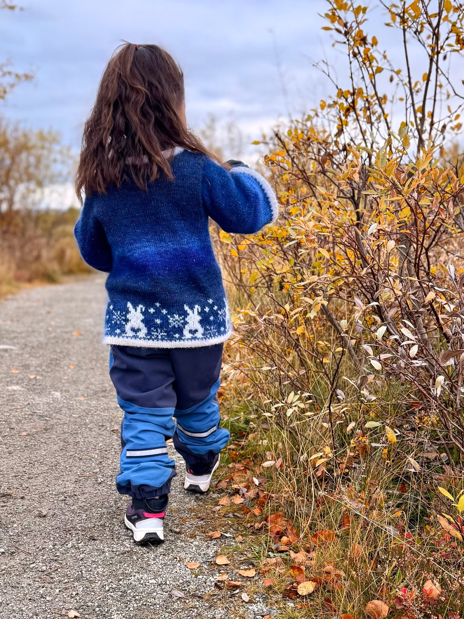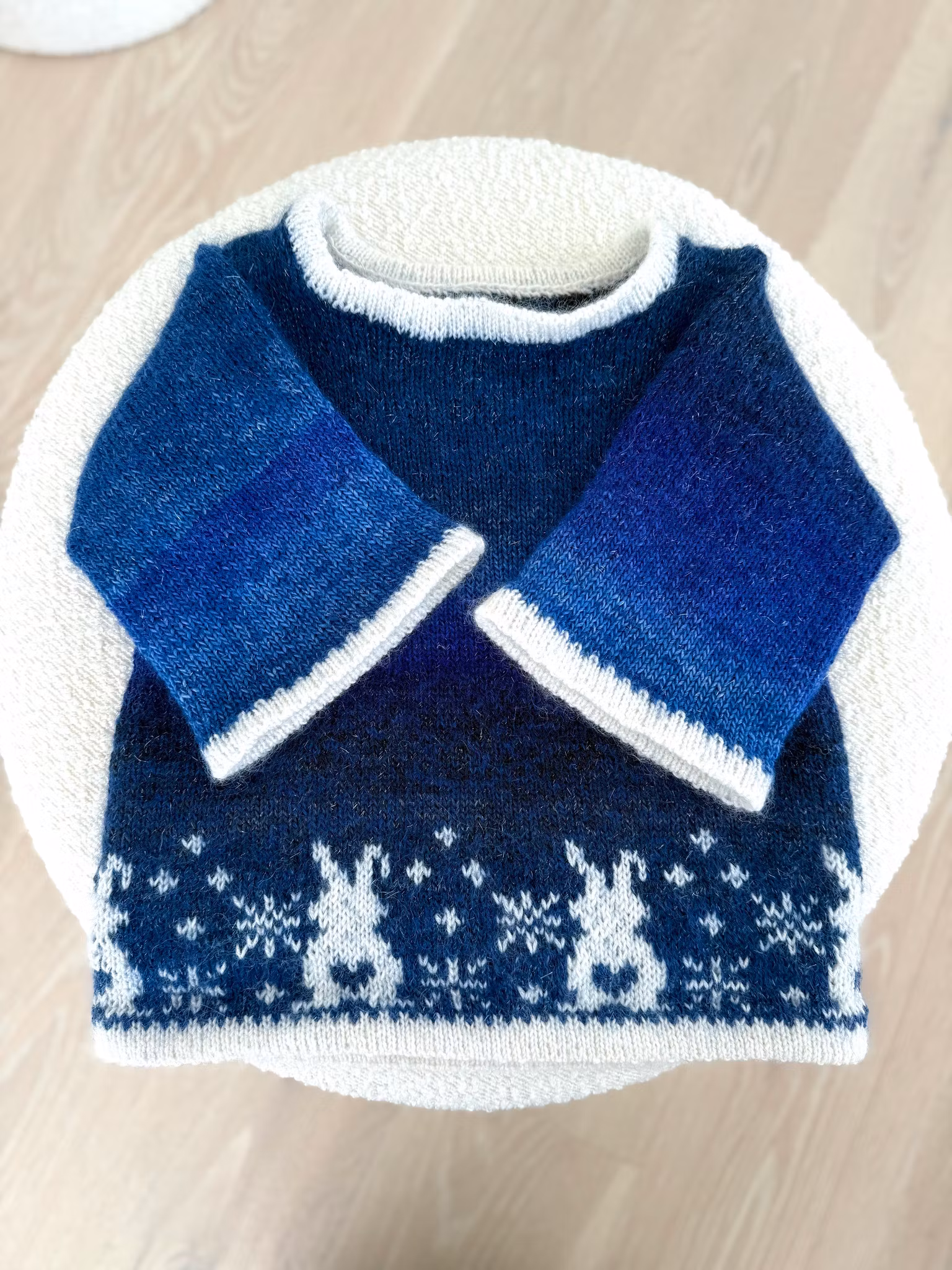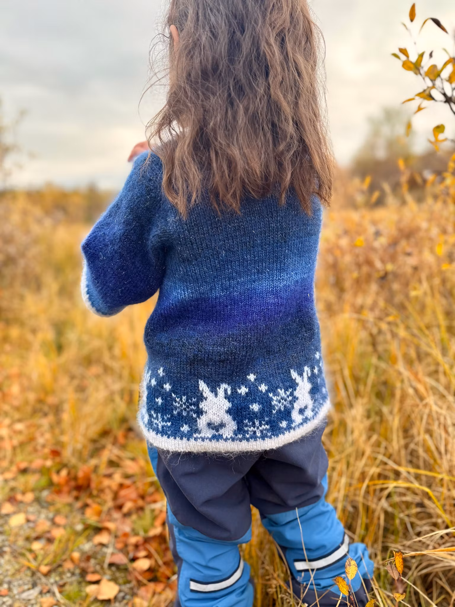 Denne vakre barnegenseren har et søtt harepusmotiv og strikkes med glittergarn for en magisk effekt. Modellen har en lett klokkeform som gir en behagelig passform, og strikkes med to tråder for ekstra varme og mykhet.