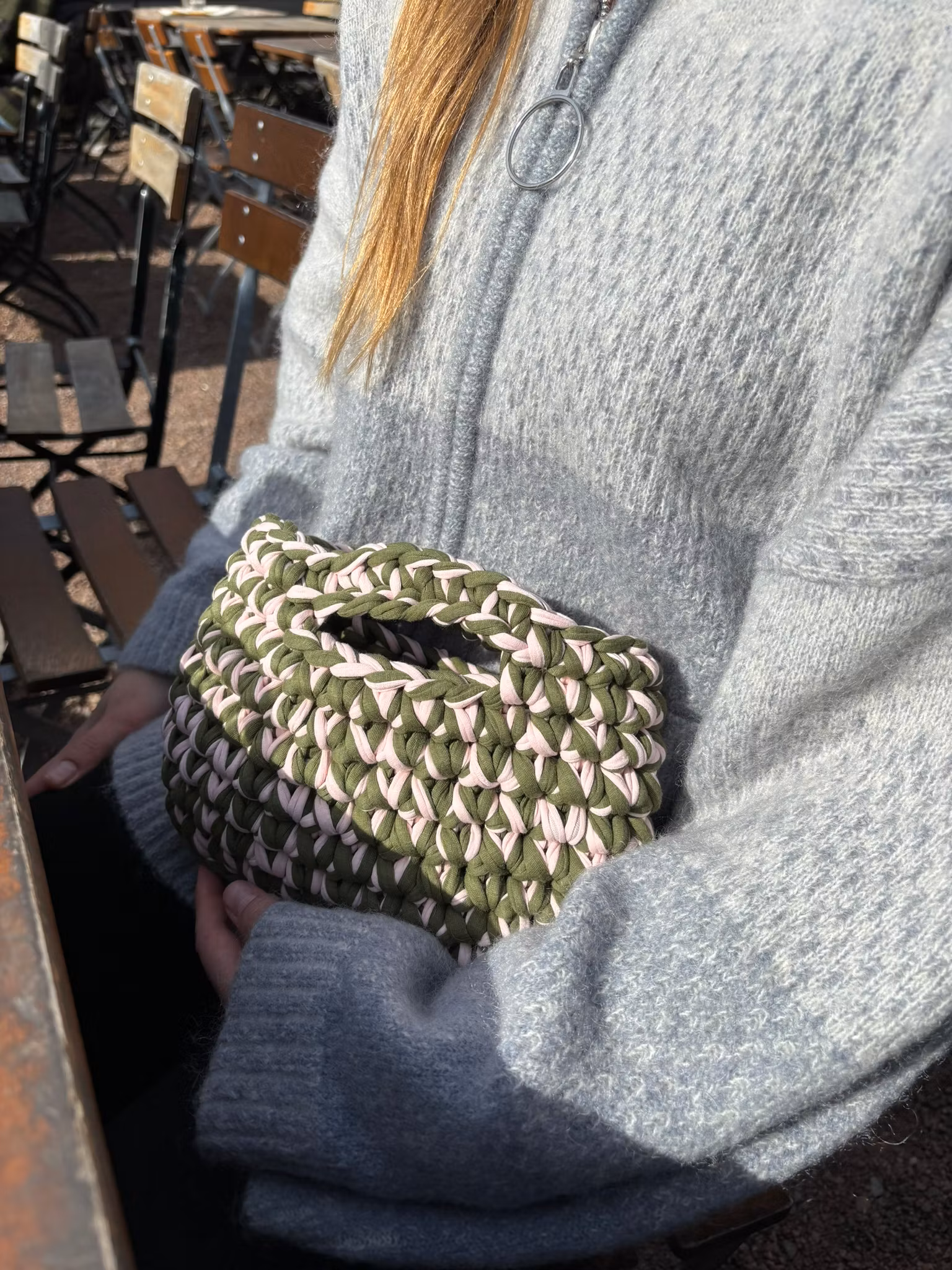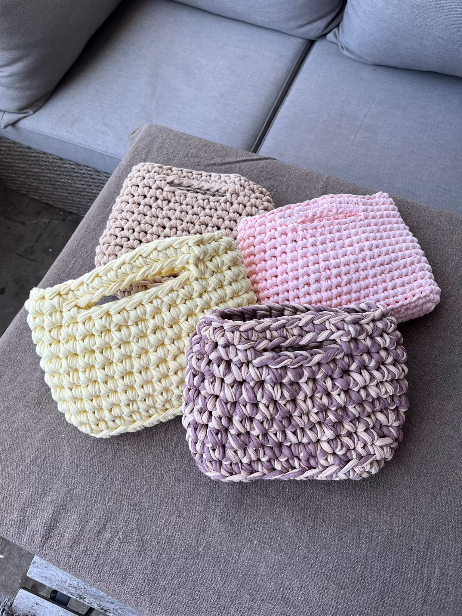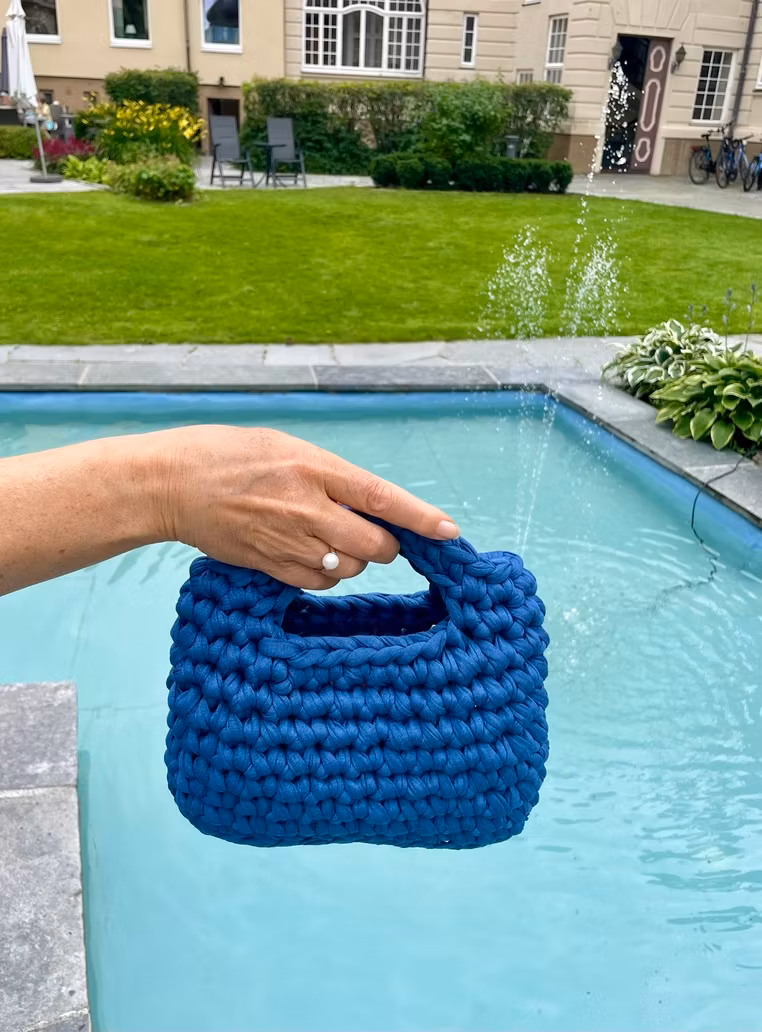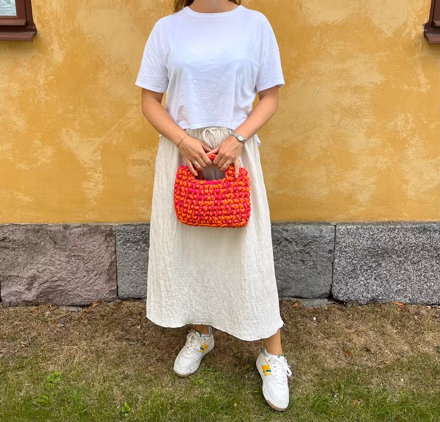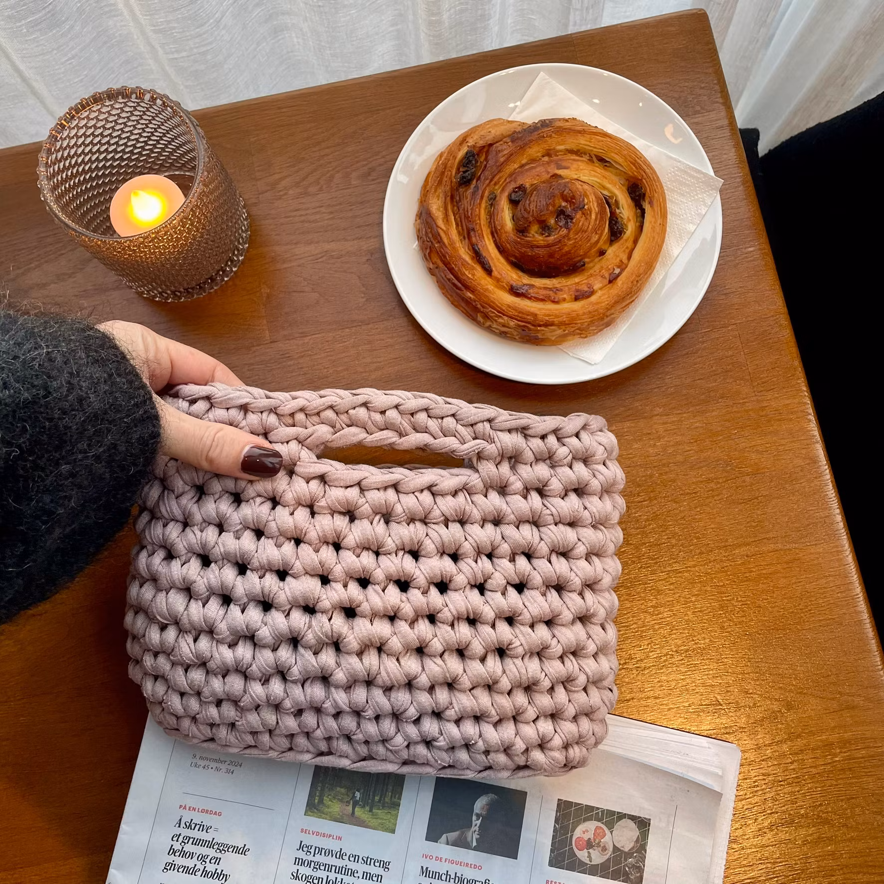 Maritveska er en liten, chunky veske med innebygde håndtak og masse sjarm! Den hekles i ett stykke med tykt båndgarn og store masker, og passer perfekt for deg som vil lage noe praktisk og fint – uten for mye dill.