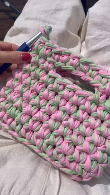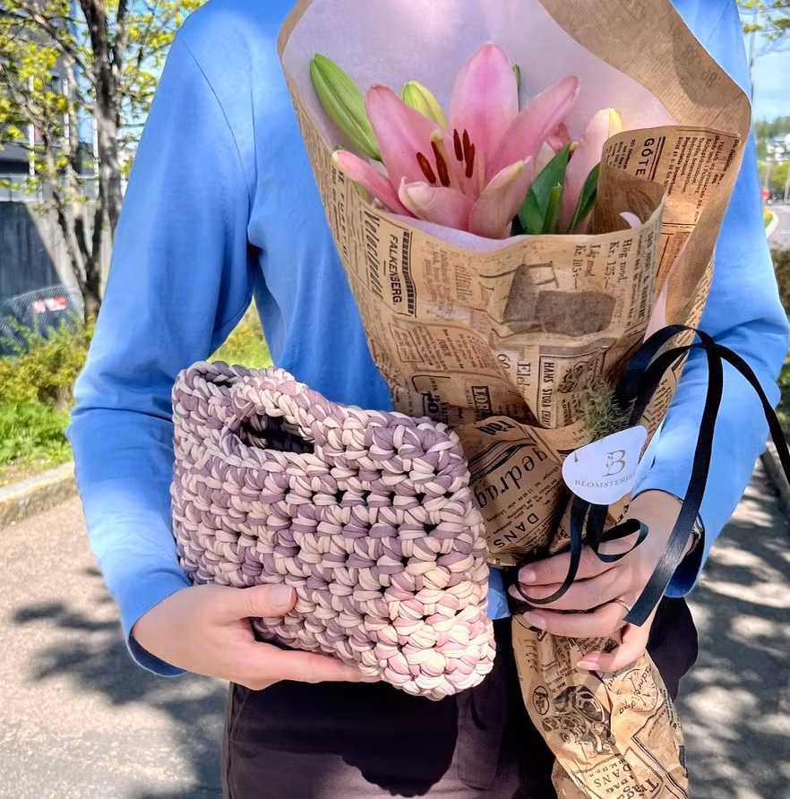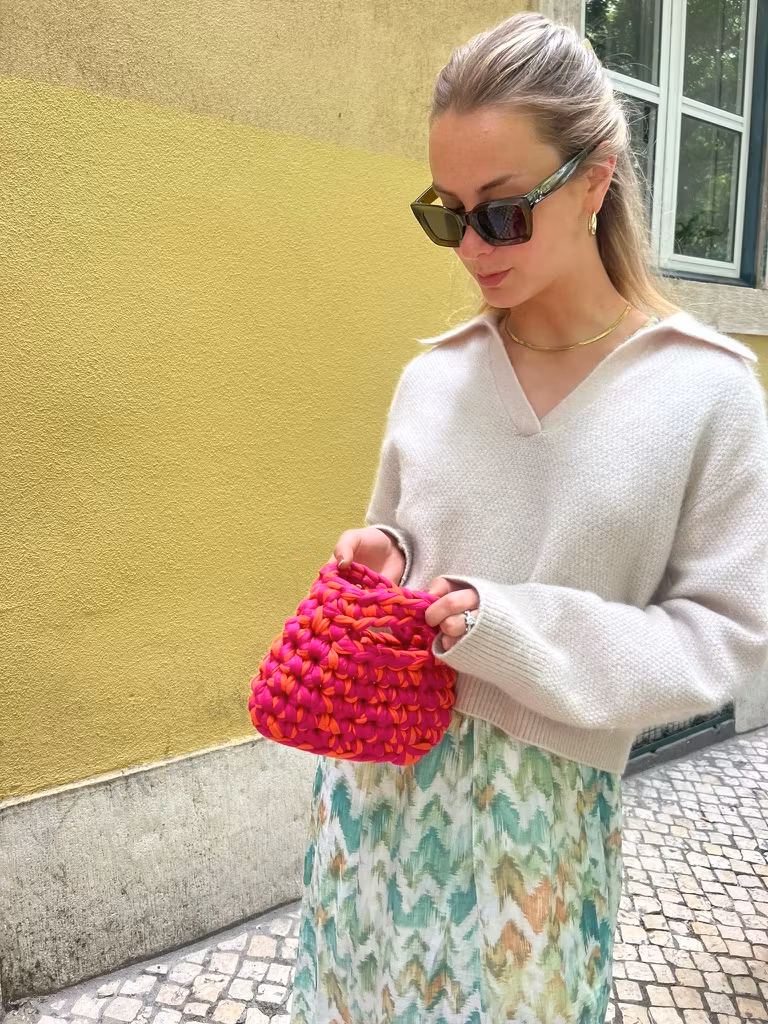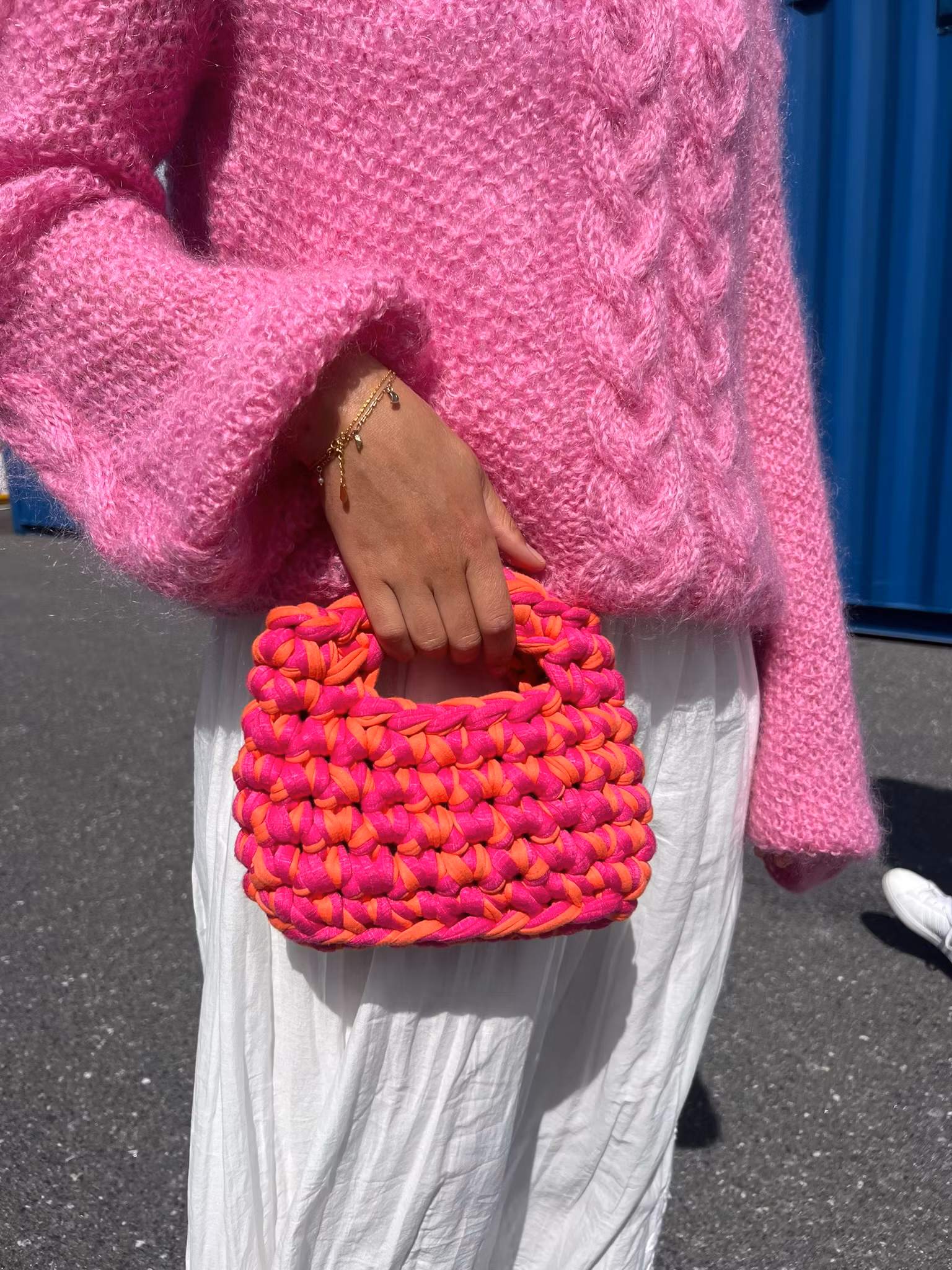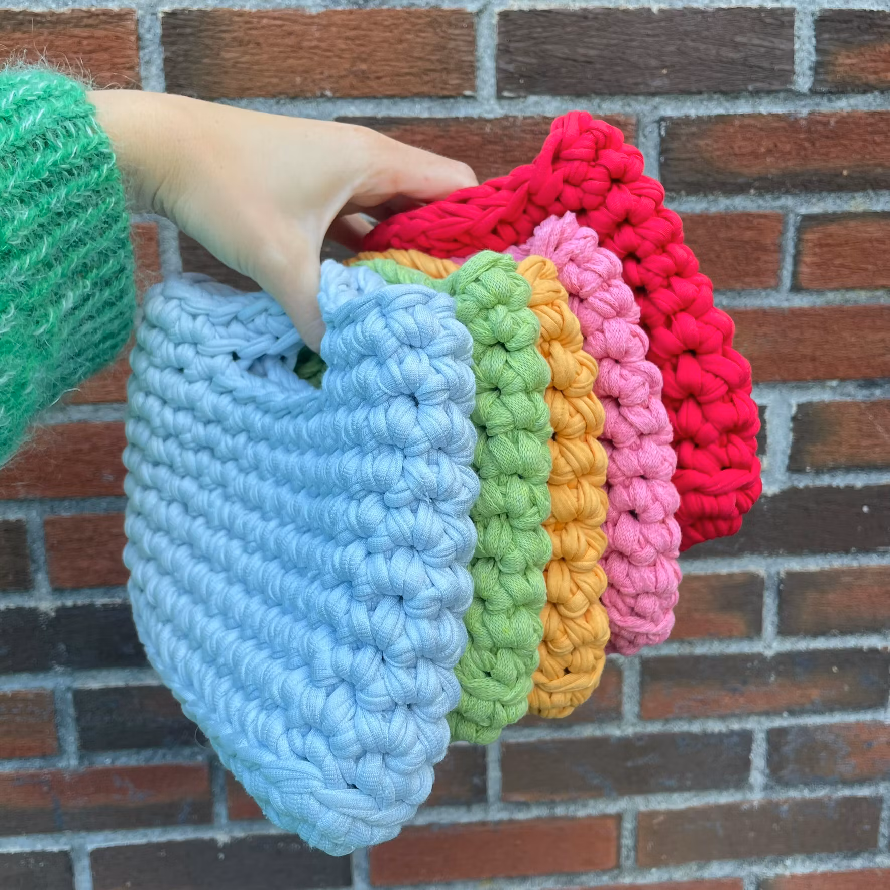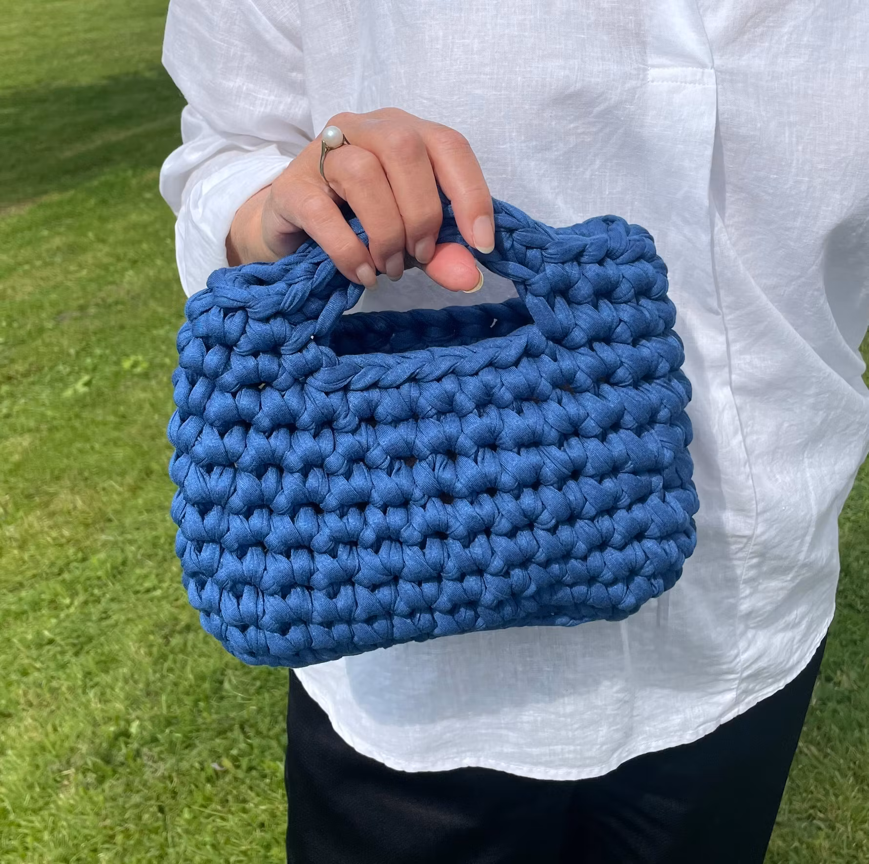 Maritveska er en liten, chunky veske med innebygde håndtak og masse sjarm! Den hekles i ett stykke med tykt båndgarn og store masker, og passer perfekt for deg som vil lage noe praktisk og fint – uten for mye dill.