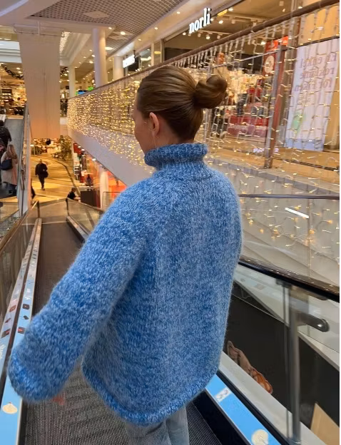 Agnesgenseren Slim er en nettere og mer figurnær versjon av originalen, med høy hals og myk, fluffy struktur. Den strikkes nedenfra og opp og formes med raglanfelling for et klassisk og feminint uttrykk.