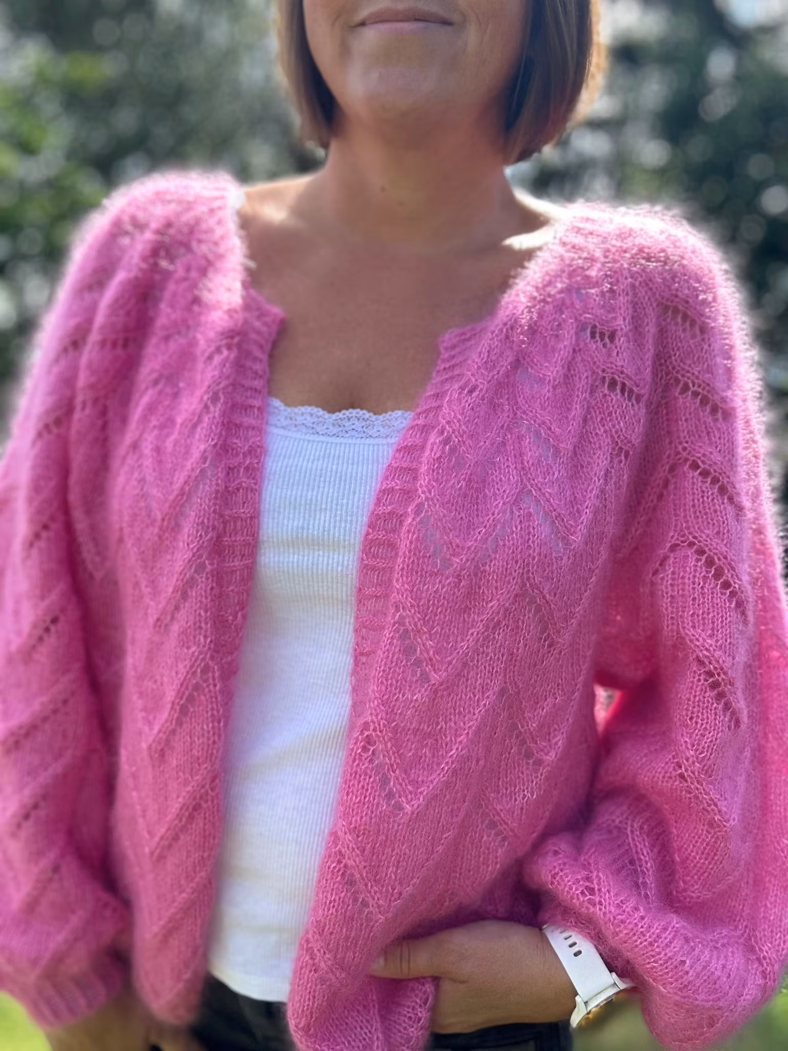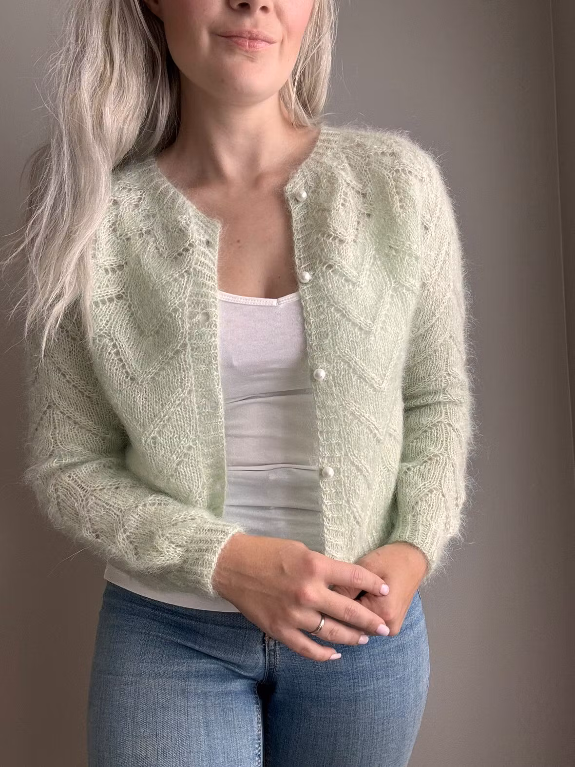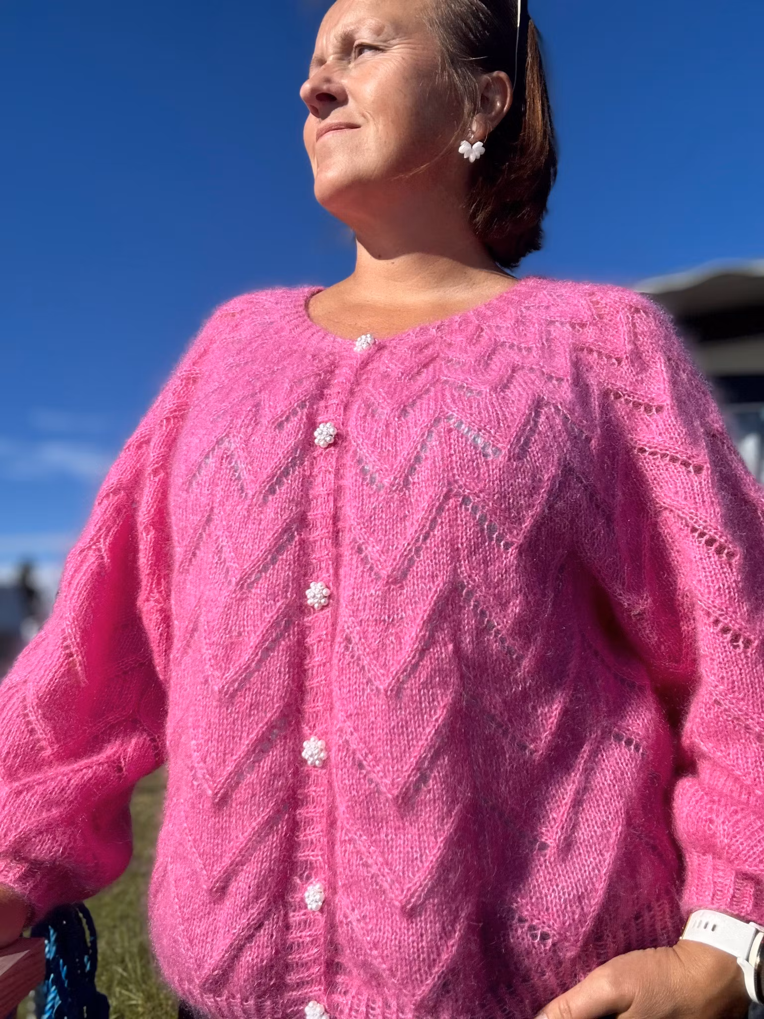 Arrowina Cardigan fra Abbaknit Design er en feminin og lekker jakke med et dekorativt pilmønster som virkelig kommer til sin rett i myk mohair og silke. Jakken strikkes ovenfra og ned med nydelige strukturelle detaljer og en gjennomarbeidet passform. Perfekt for deg som liker å strikke med diagrammer og ønsker et luftig, men varmt plagg med det lille ekstra.