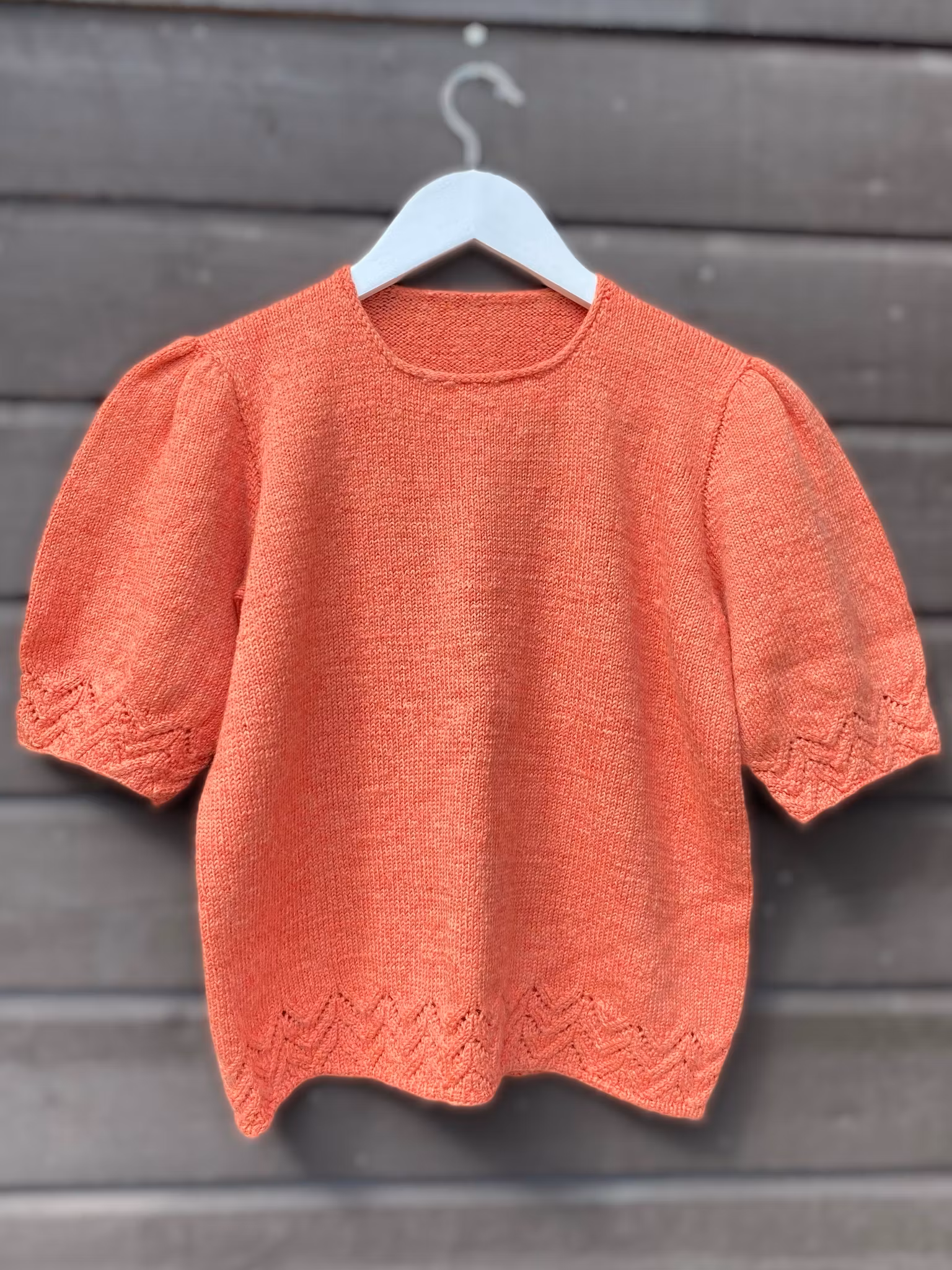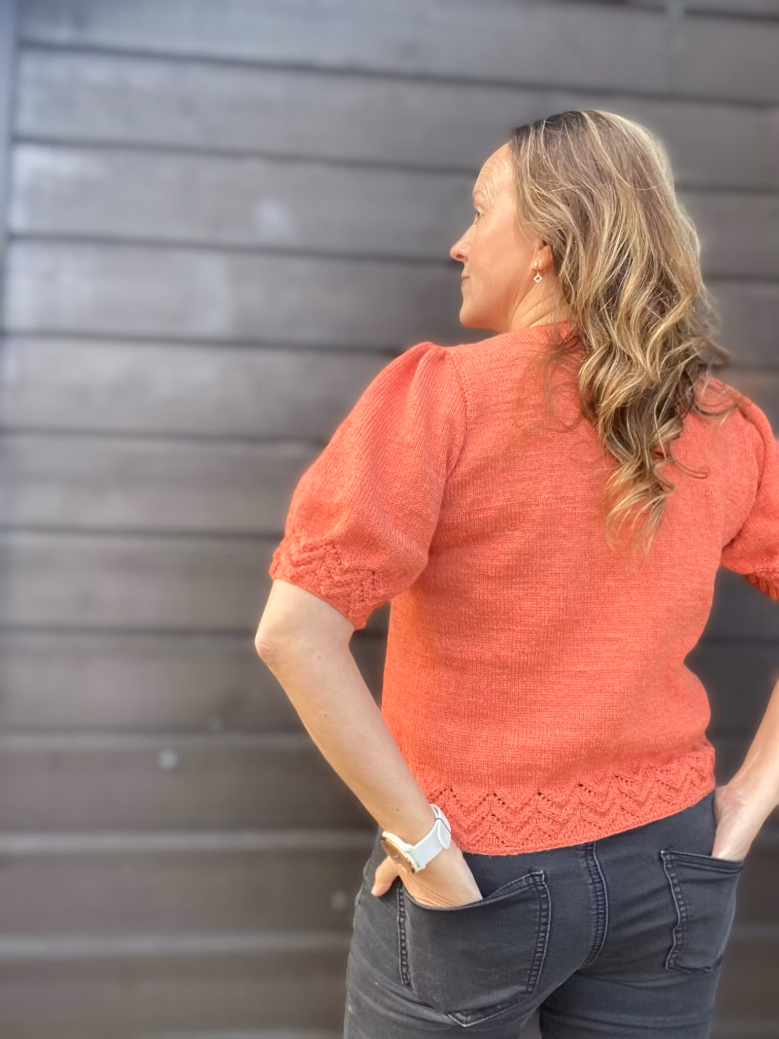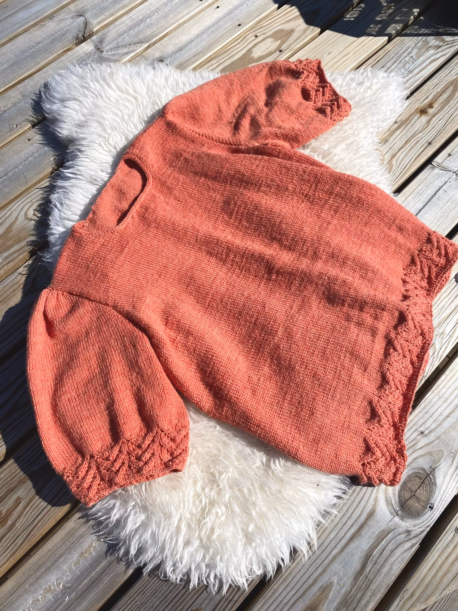 Arrowina Jumper er en elegant og lett genser med et vakkert pilinspirert mønster som setter prikken over i-en. Genseren strikkes ovenfra og ned med raffinerte detaljer som puffede ermer, dobbeltstrikkede kanter og en dekorativ avslutning i Arrowina-mønsteret. Den korte modellen gir et moderne uttrykk, og den lette merinoullen sørger for en behagelig og myk kvalitet du kan bruke året rundt.