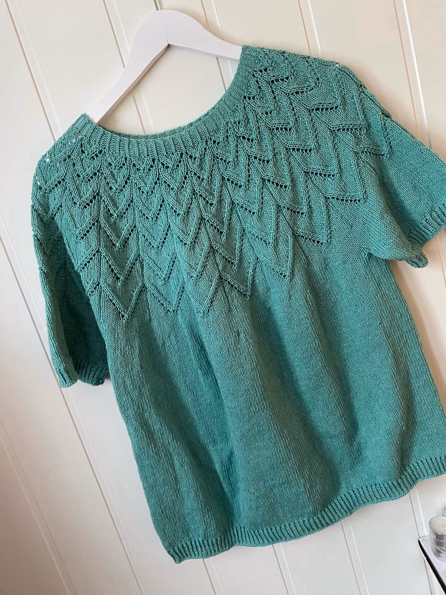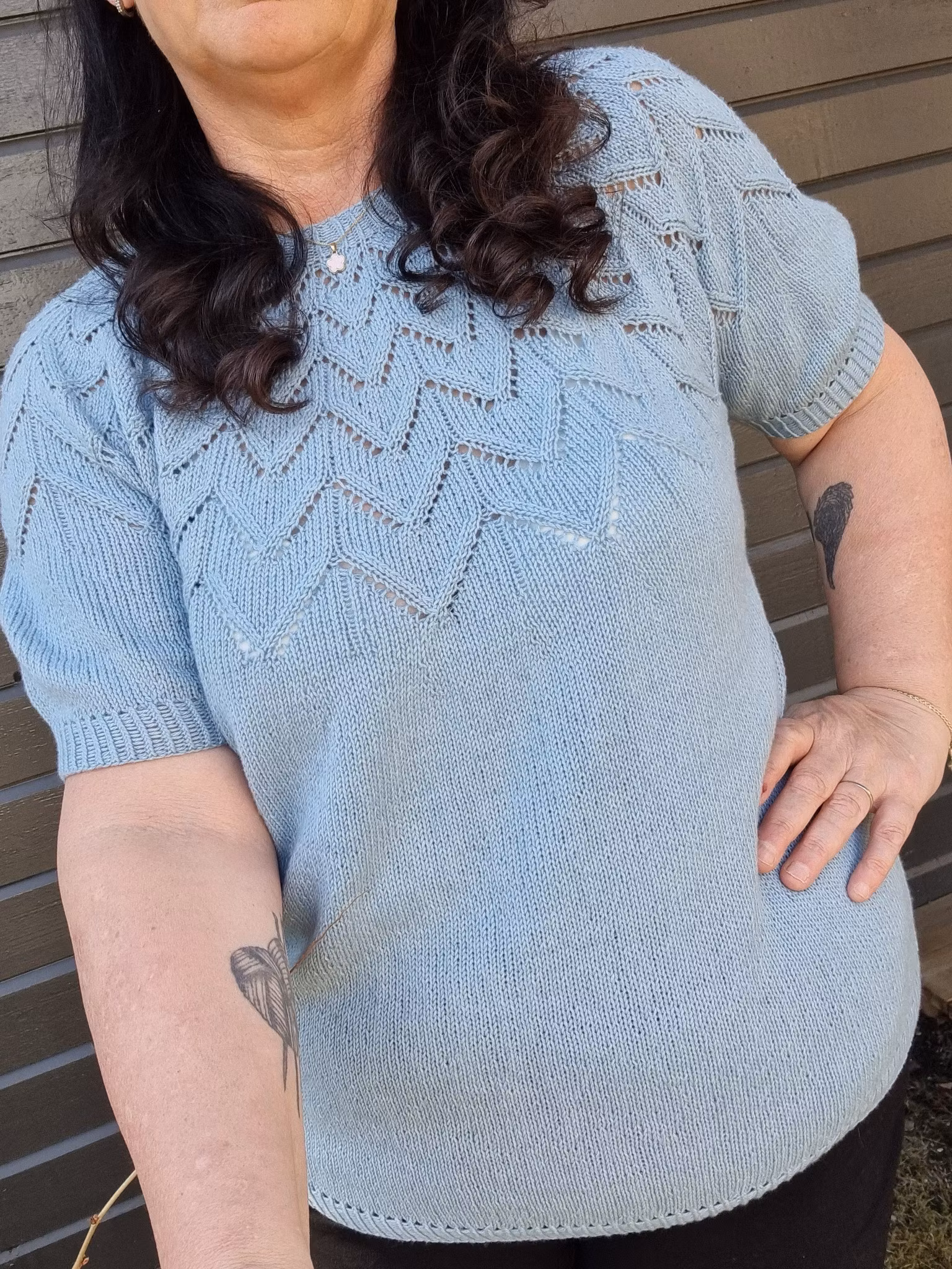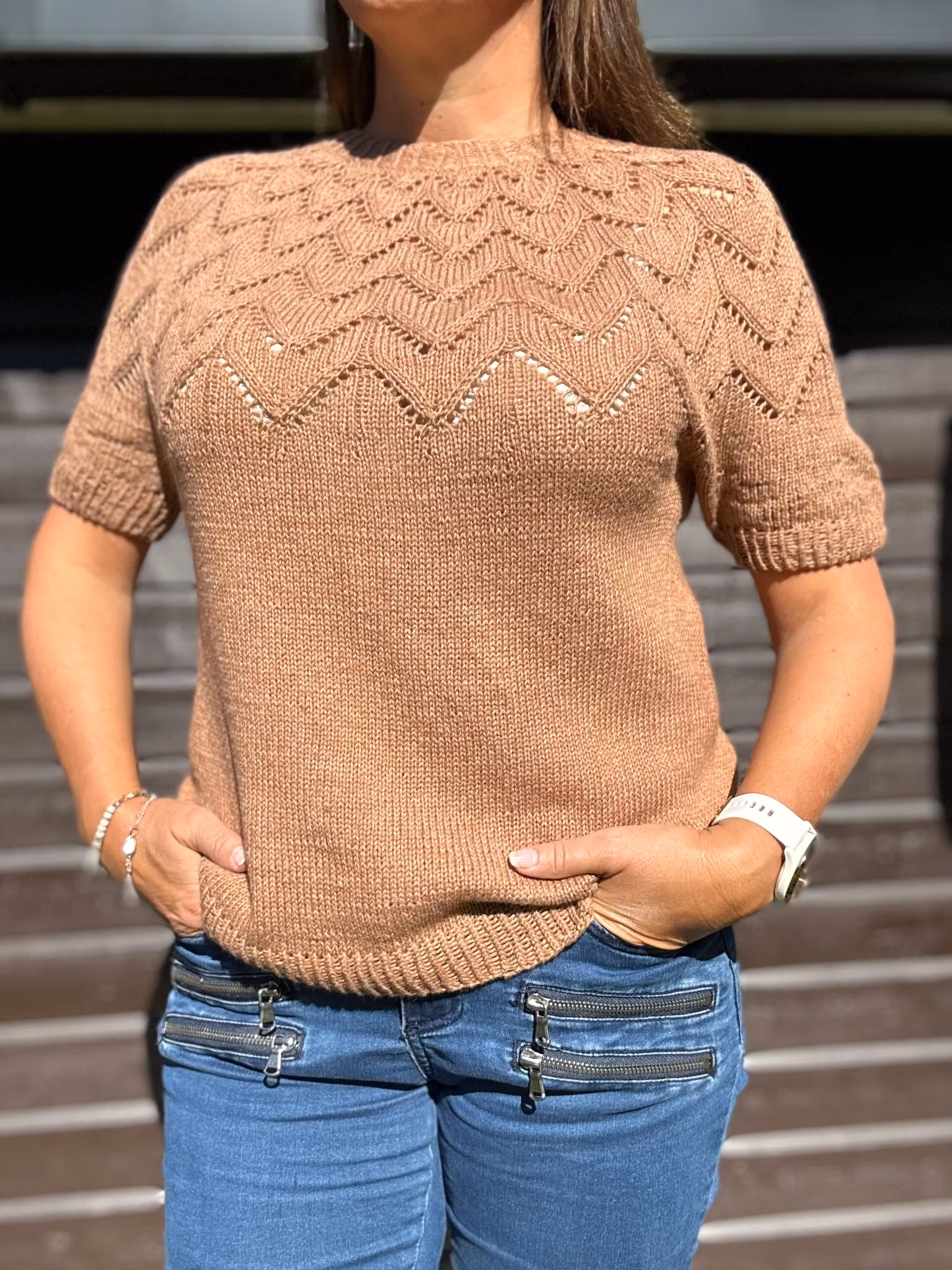 Arrowina Topp er en sommerlig og anvendelig overdel strikket i en deilig blanding av merinoull og bomull. Med sitt luftige og iøynefallende pilinspirerte strukturmønster på bærestykket, er dette et plagg som virkelig skiller seg ut. Toppen strikkes ovenfra og ned, og det gir deg god mulighet til å tilpasse lengden underveis.