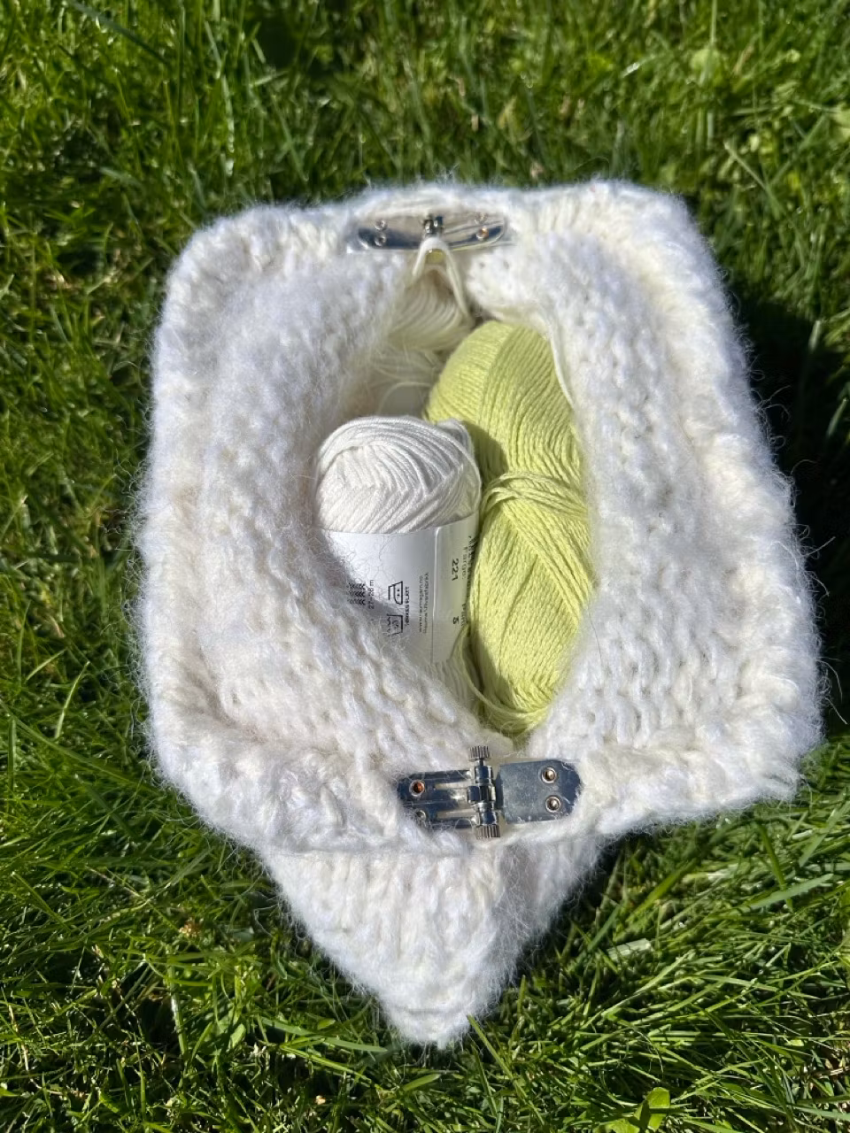 Chunky Clutch er en trendy og myk håndstrikket veske laget med restegarn i tykt, deilig garn. Med kombinasjonen av Børstet Alpakka, Rauma Vams og et diskret effektgarn med glitter, får vesken både volum og et elegant preg. Designet strikkes i rettstrikk med dekorative legg foran og bak, og monteres med en stilren, firkantet veskebøyle på 20 cm .