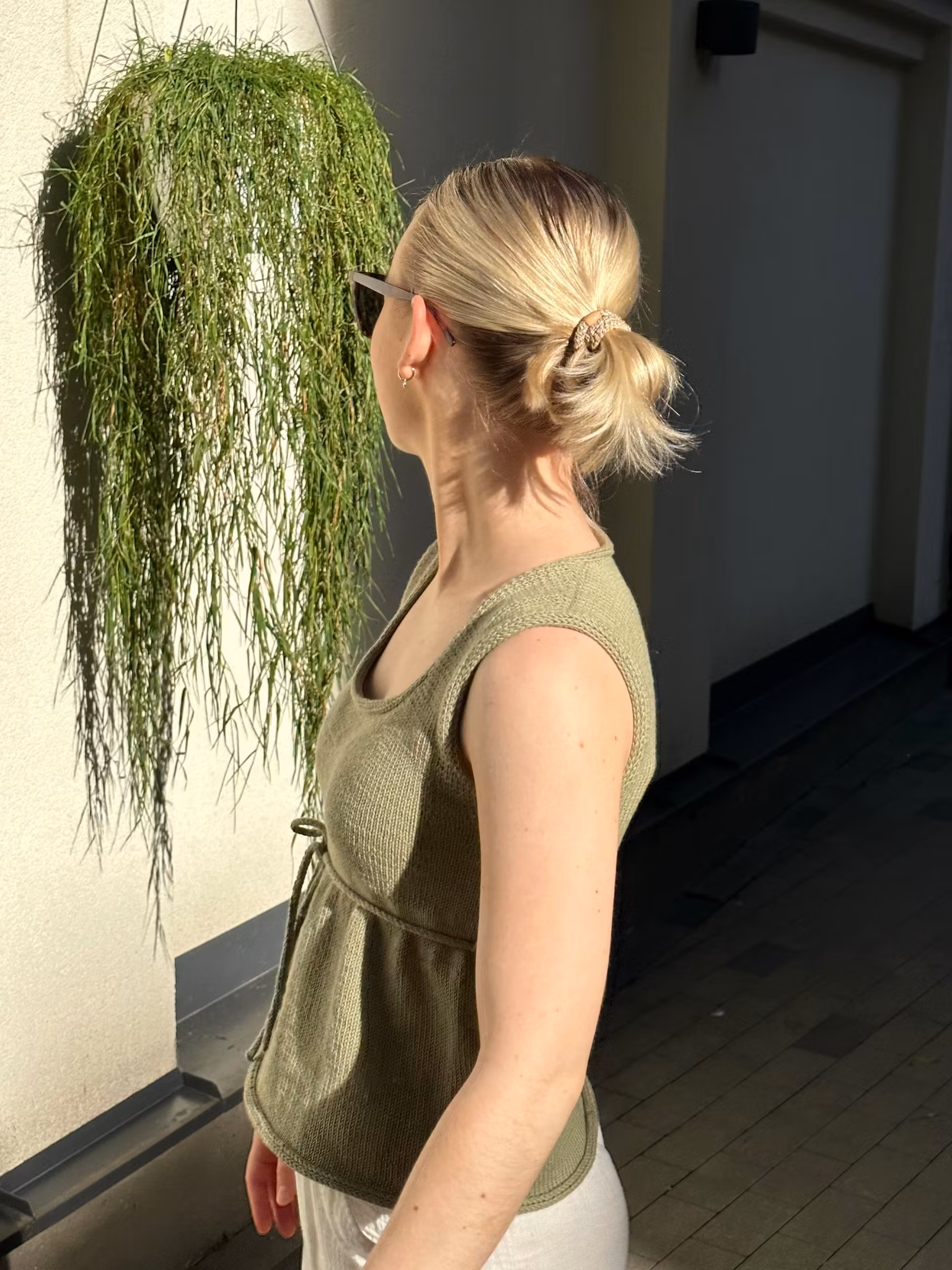 Dagnys sommertopp fra ByHollekim er en lett og gjennomarbeidet topp med rene linjer og fine detaljer. Toppen strikkes ovenfra og ned, med en konstruksjon som gir god passform over skuldre og bryst før arbeidet samles og strikkes videre rundt.