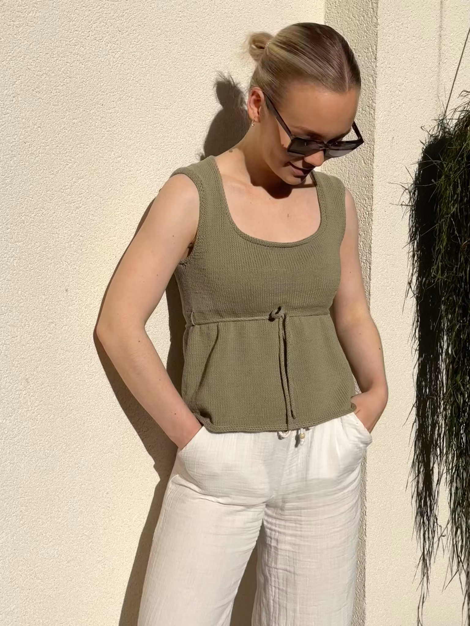 Alle kanter felles av med I-cord, noe som gir en tydelig og dekorativ avslutning langs bol, ermhull og hals. I tillegg strikkes en egen I-cord snor som trekkes gjennom hemper i sidene og knytes som belte – en detalj som gir toppen sitt karakteristiske uttrykk.