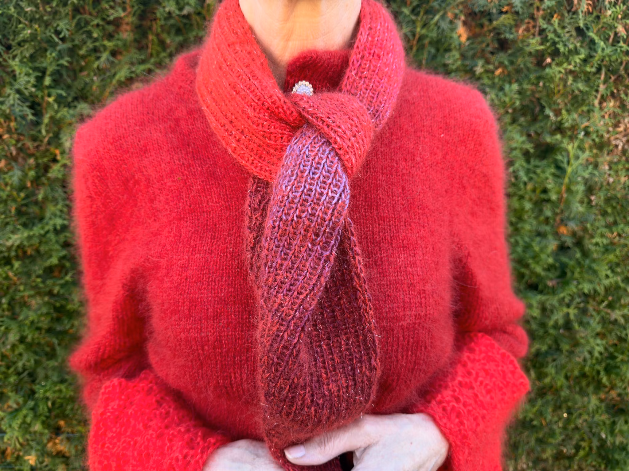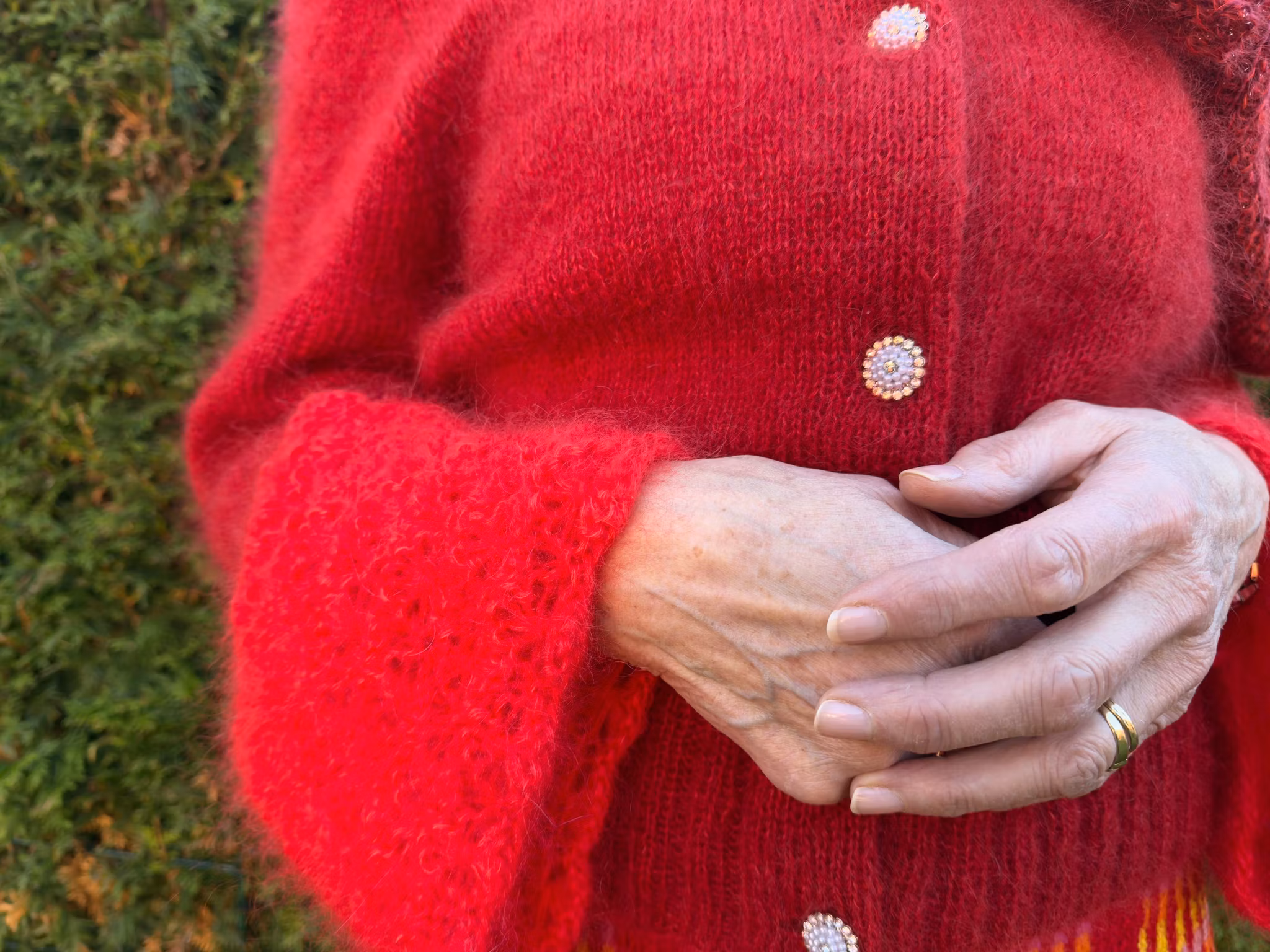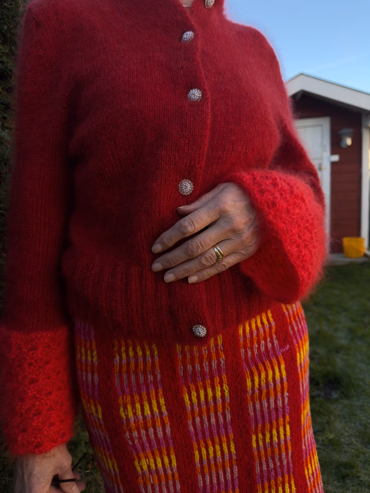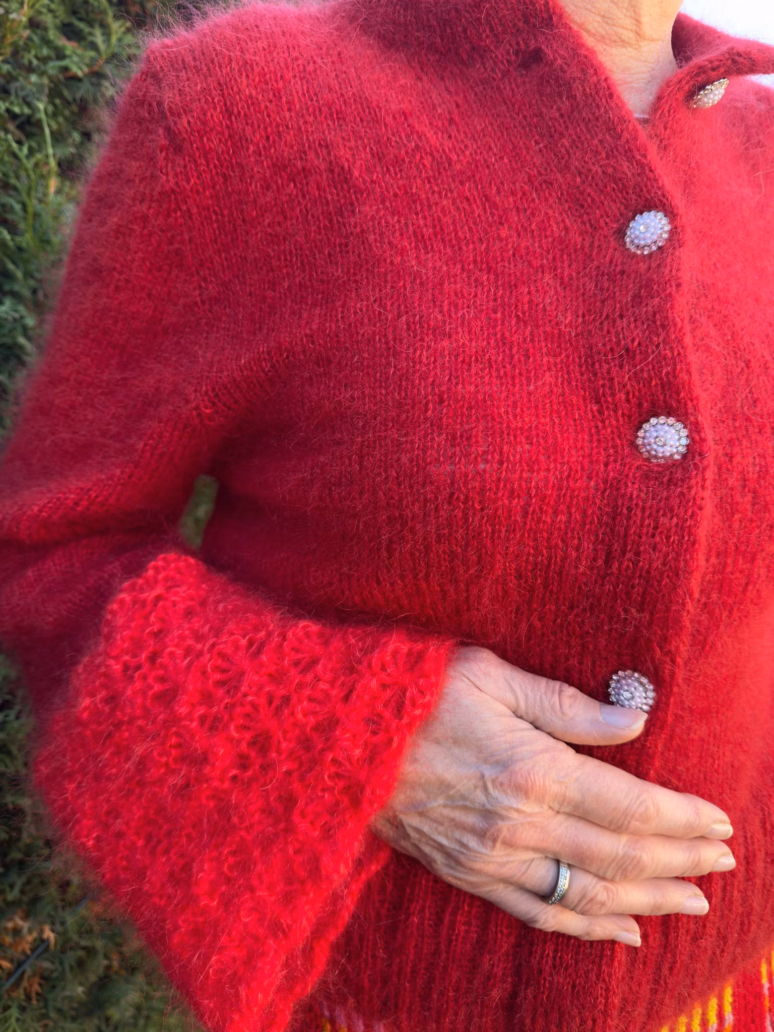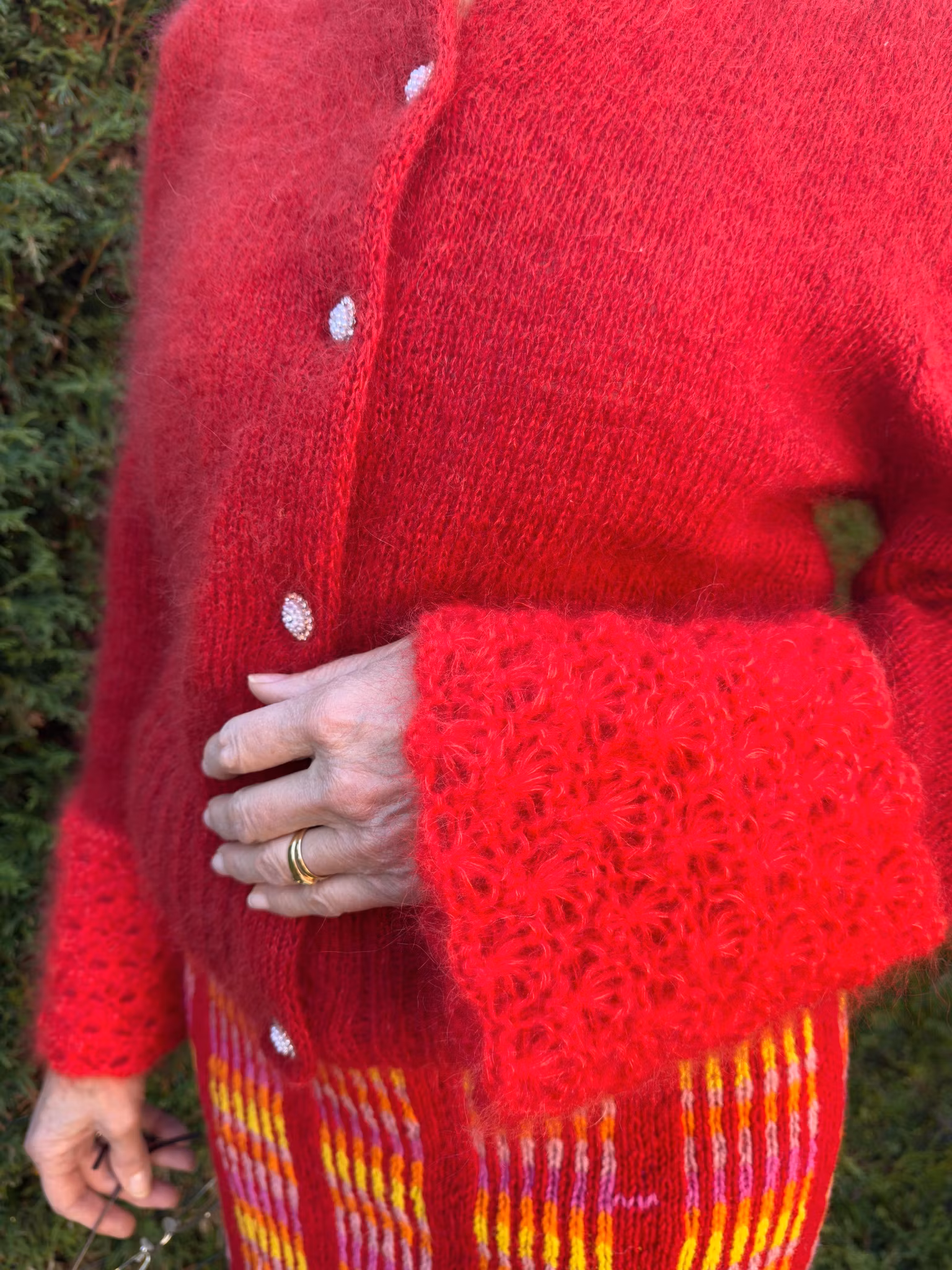Bente-cardiganen er en myk og lett jakke med rett passform, designet for å varme og imponere. Den strikkes med dobbel tråd Tynn Silk Mohair fra Sandnes Garn i tre nyanser rødt: Dyp rød, True Red og Scarlet Red. De karakteristiske flowersermene er strikket med fire tråder i det dekorative mønsteret Flowers in a Row, som gir plagget et feminint og unikt uttrykk.