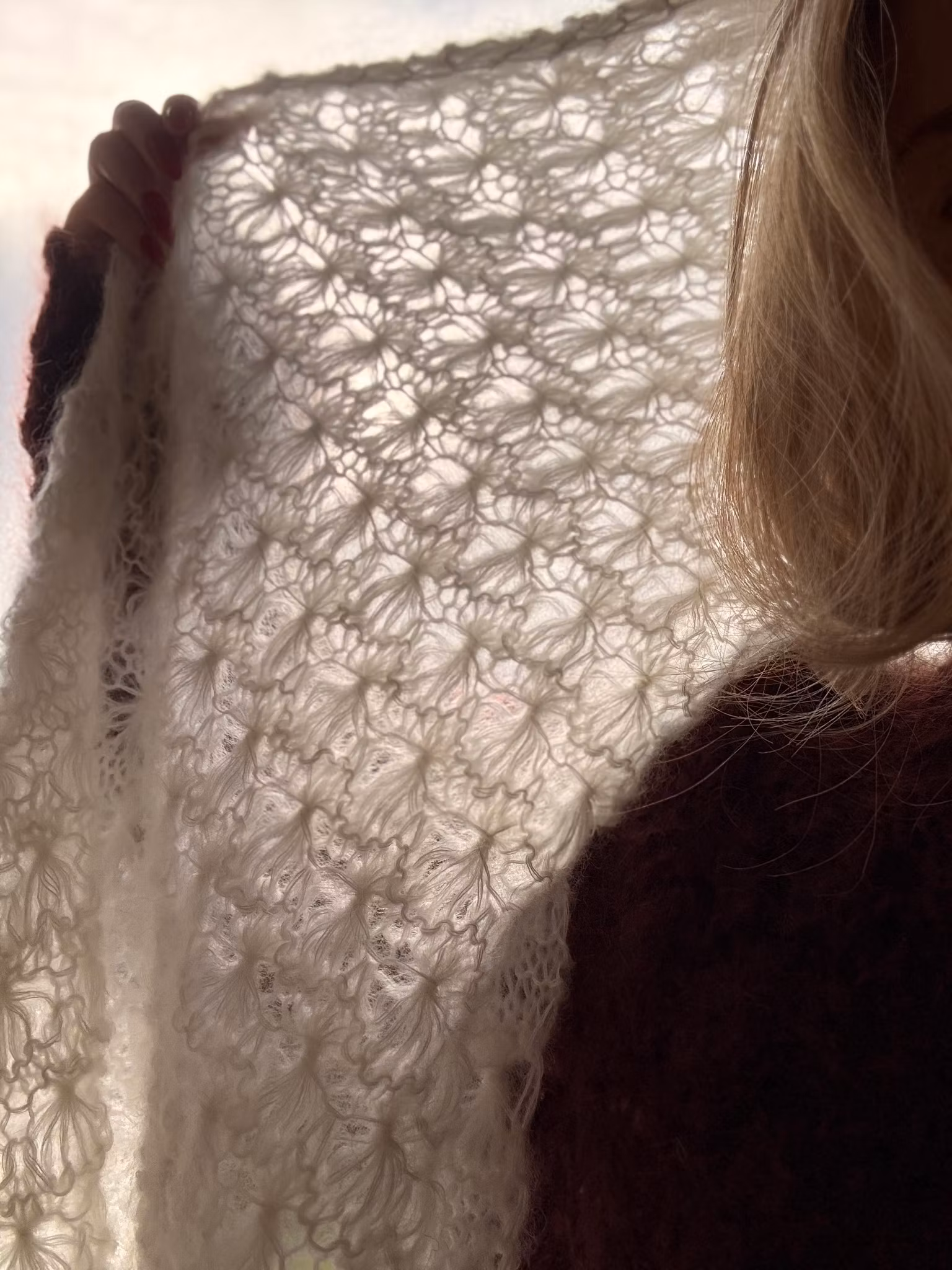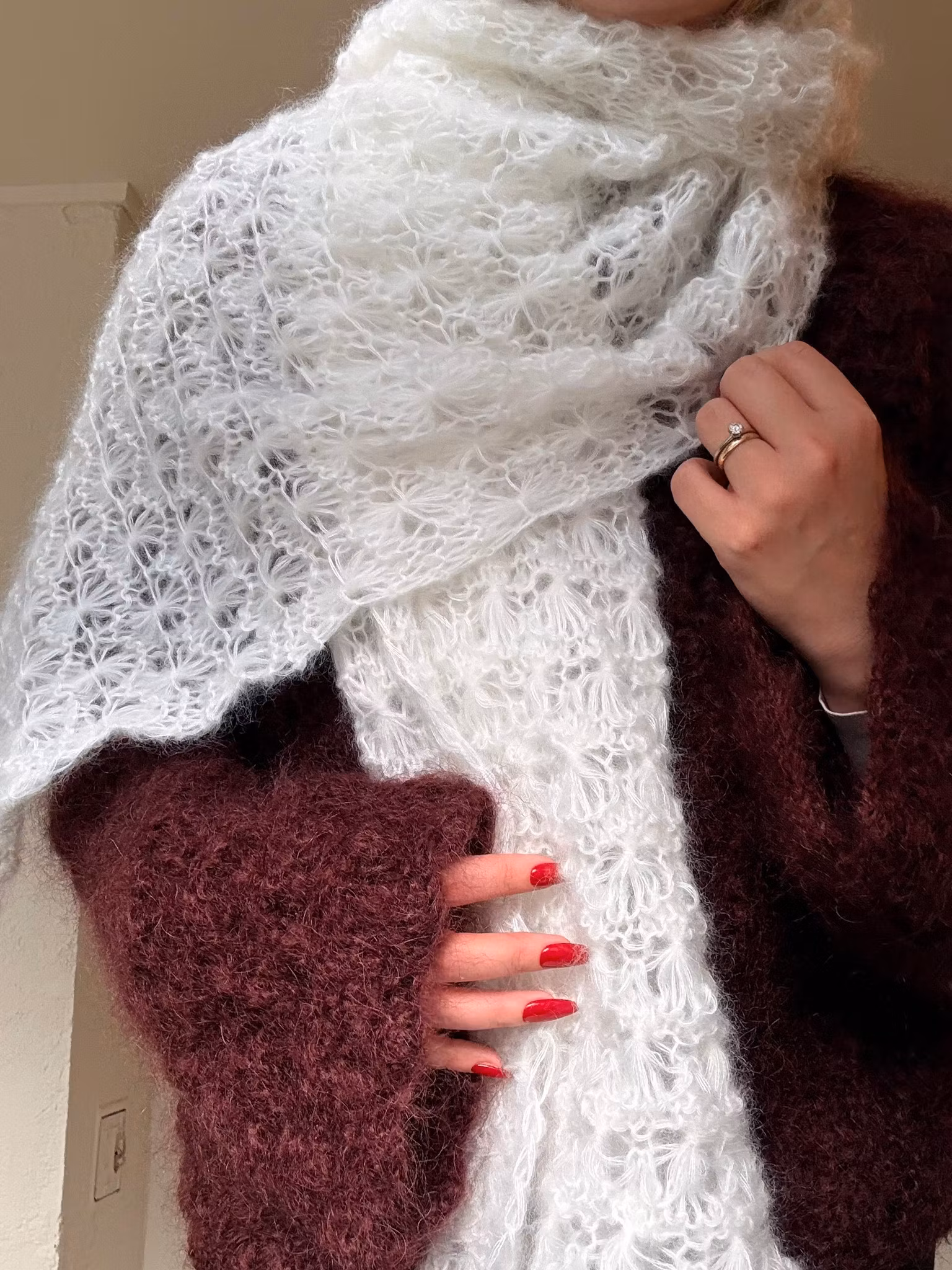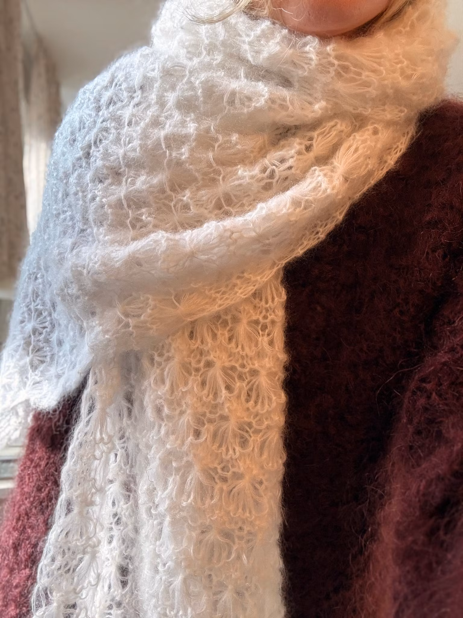 Flowers Snow er et elegant og mykt skjerf som strikkes med teknikken Flowers in a Row, også kjent som blomsterrekker. Skjerfet har et luftig og romantisk uttrykk, med små, delikate blomster formet av kast og løkketeknikk – perfekt for kjølige dager der du vil føle deg både varm og stilfull.