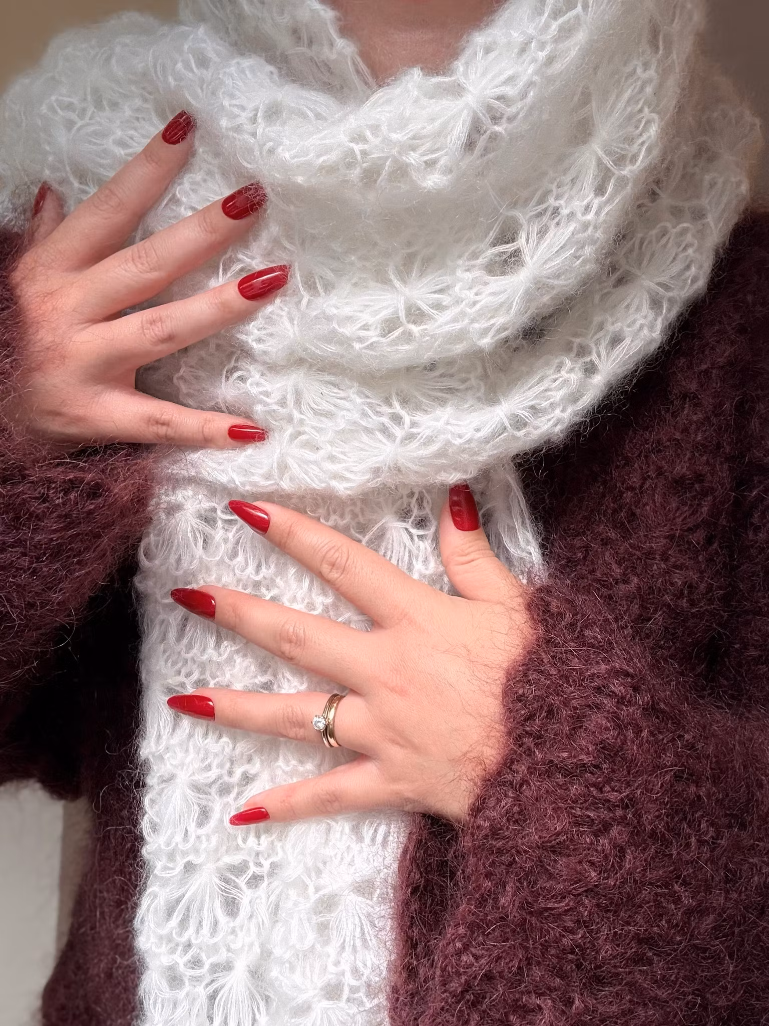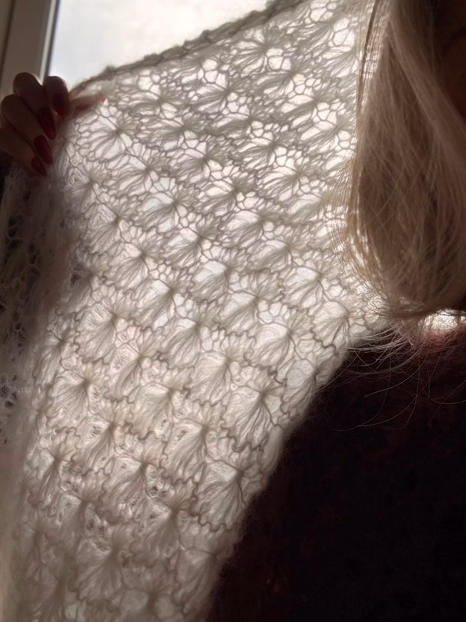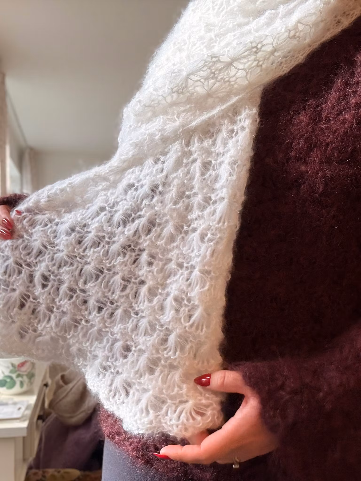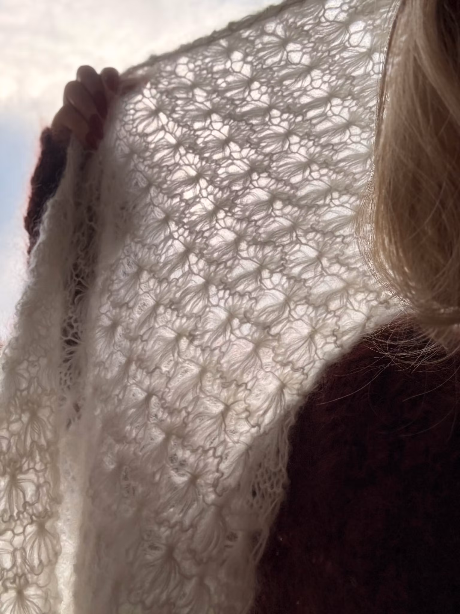 Flowers Snow er et elegant og mykt skjerf som strikkes med teknikken Flowers in a Row, også kjent som blomsterrekker. Skjerfet har et luftig og romantisk uttrykk, med små, delikate blomster formet av kast og løkketeknikk – perfekt for kjølige dager der du vil føle deg både varm og stilfull.