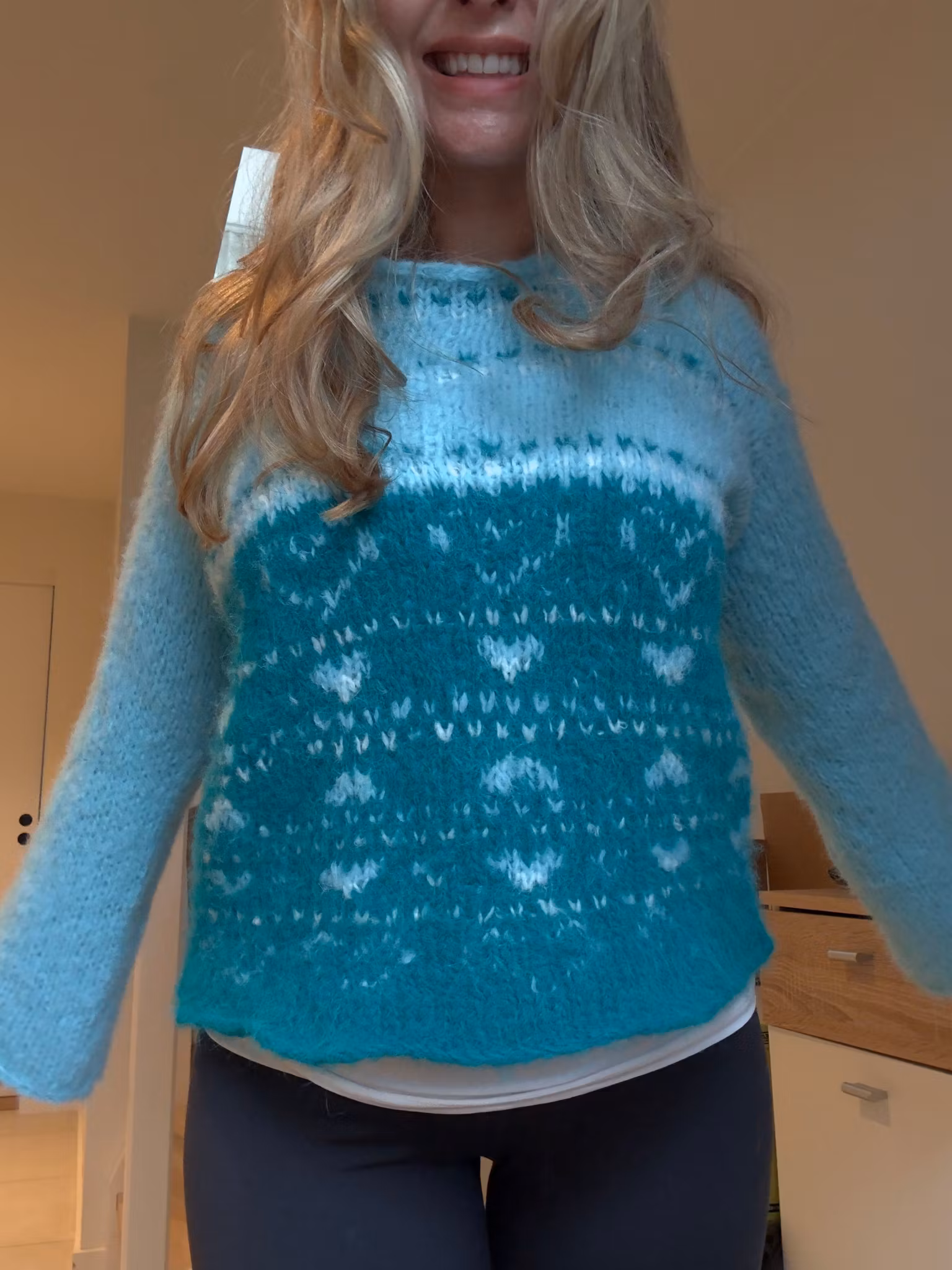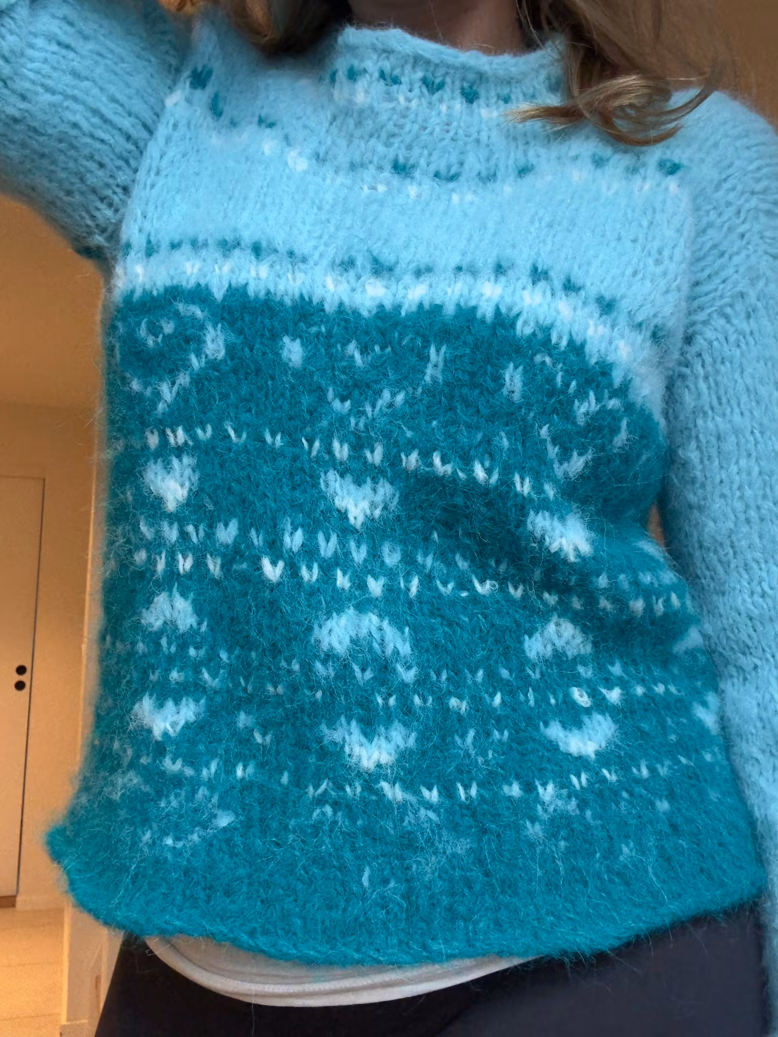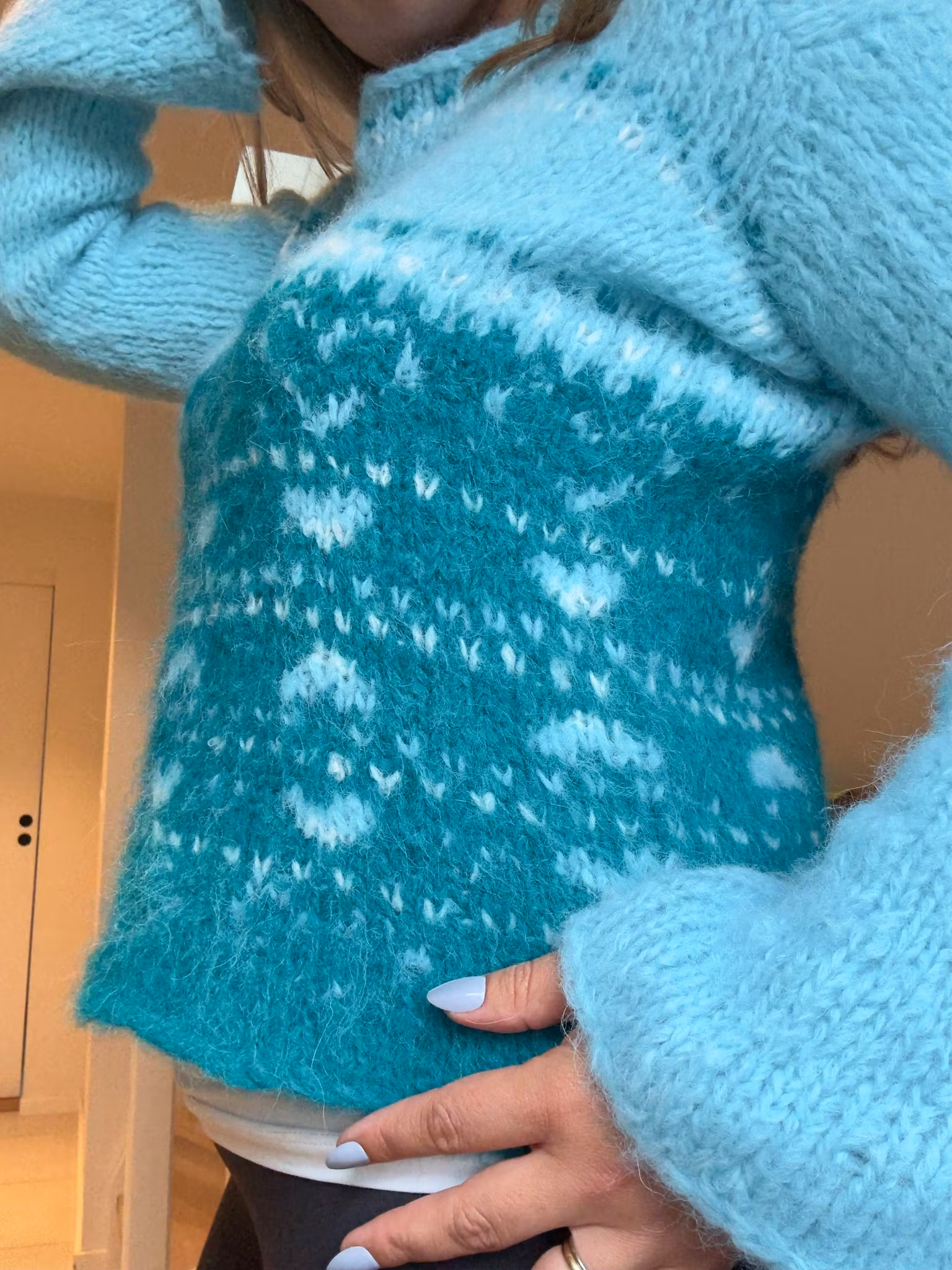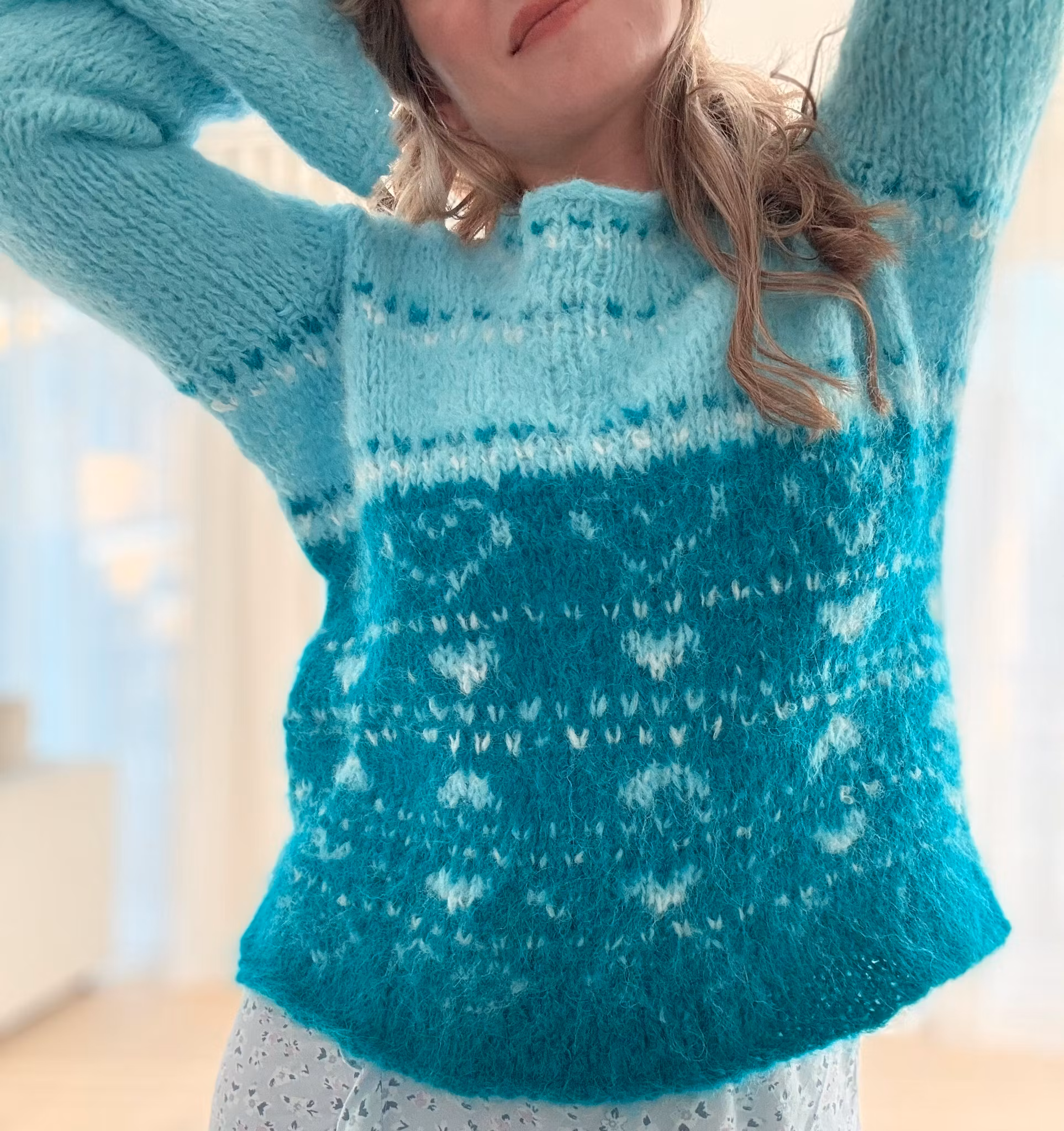 Green Heart er en nydelig, håndstrikket genser med et tydelig budskap: Måtte verden velge kjærlighet. Den strikkes i den luksuriøse garnkvaliteten Fnugg fra House of Yarn, og kombinerer fargene Caribbean Blue, Tropical Blue og White for et harmonisk og hjertevarmt uttrykk. Genseren har et karakteristisk hjertemønster over bolen og to ekstra hjerter ved halskanten for en ekstra detaljrik finish.