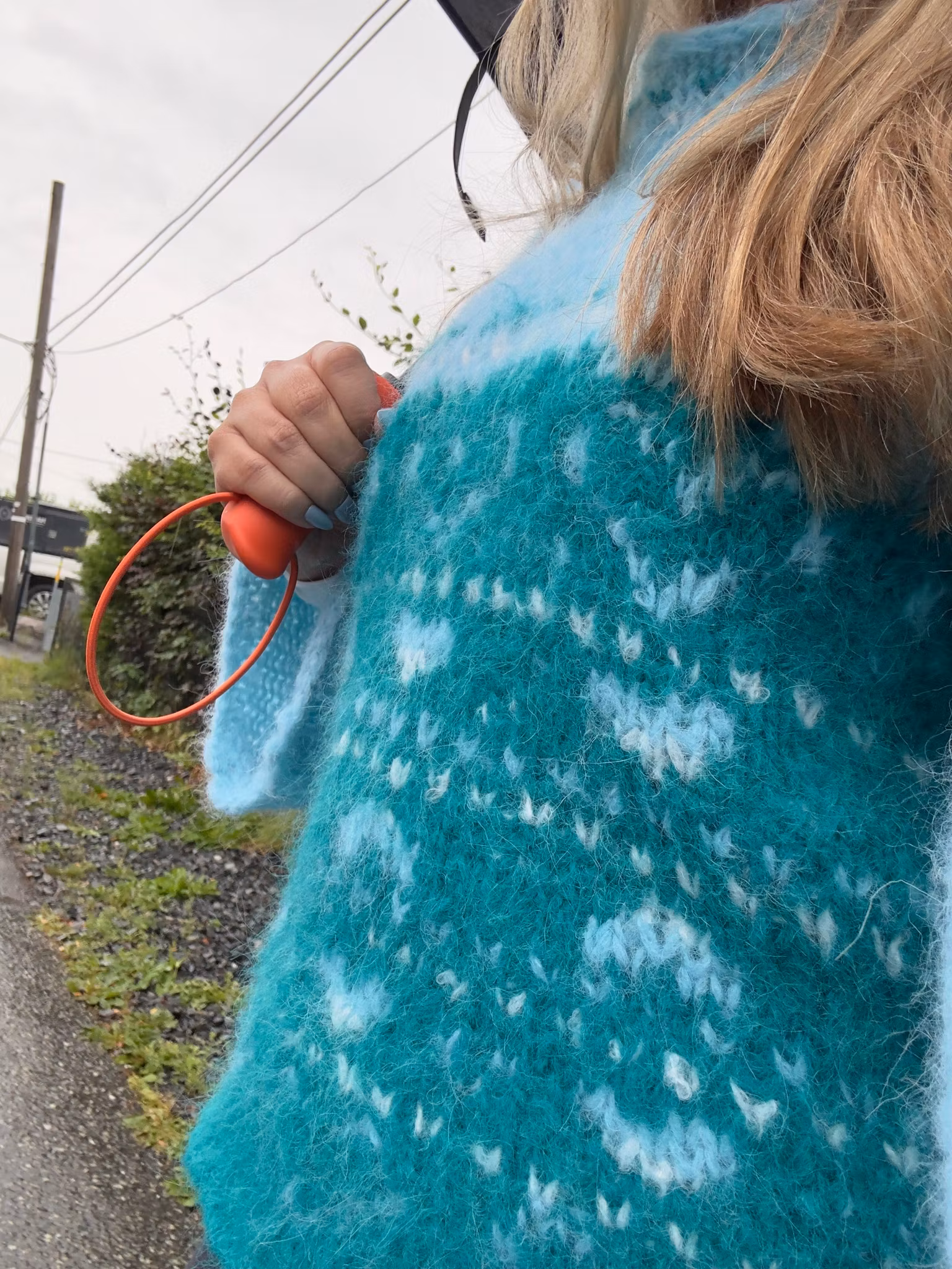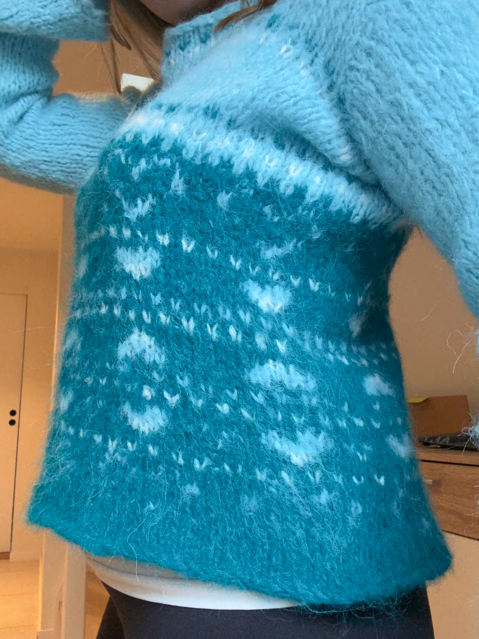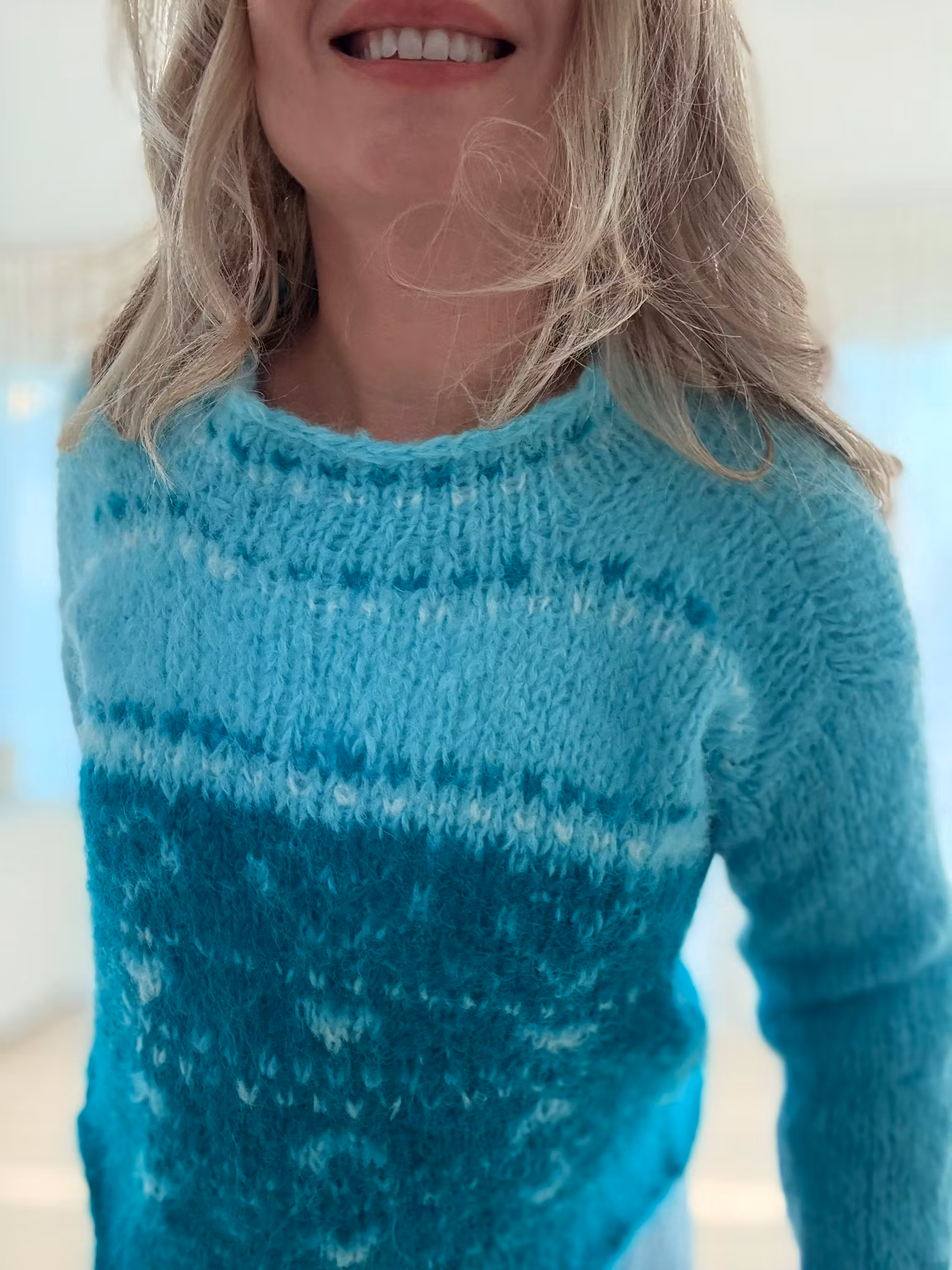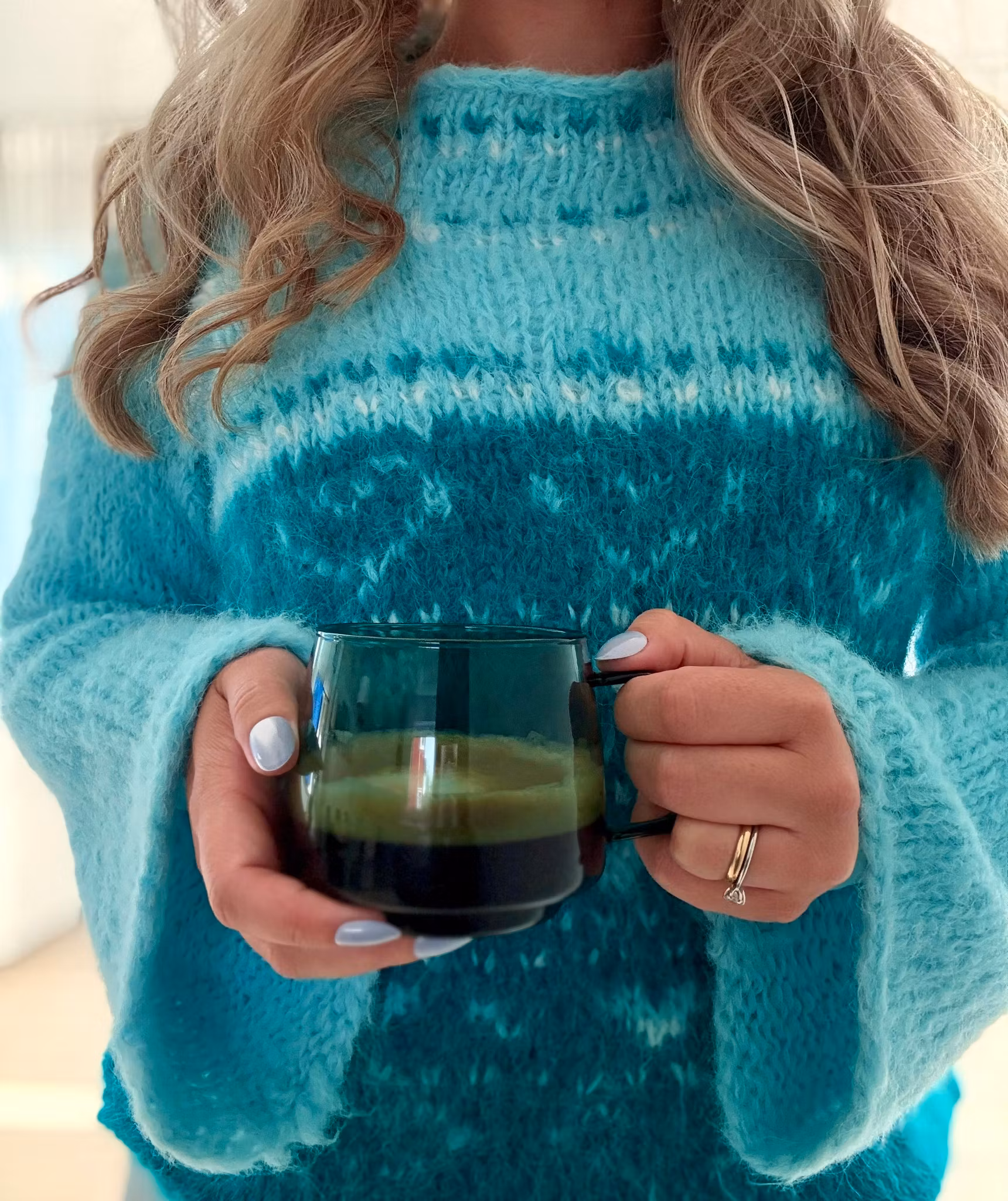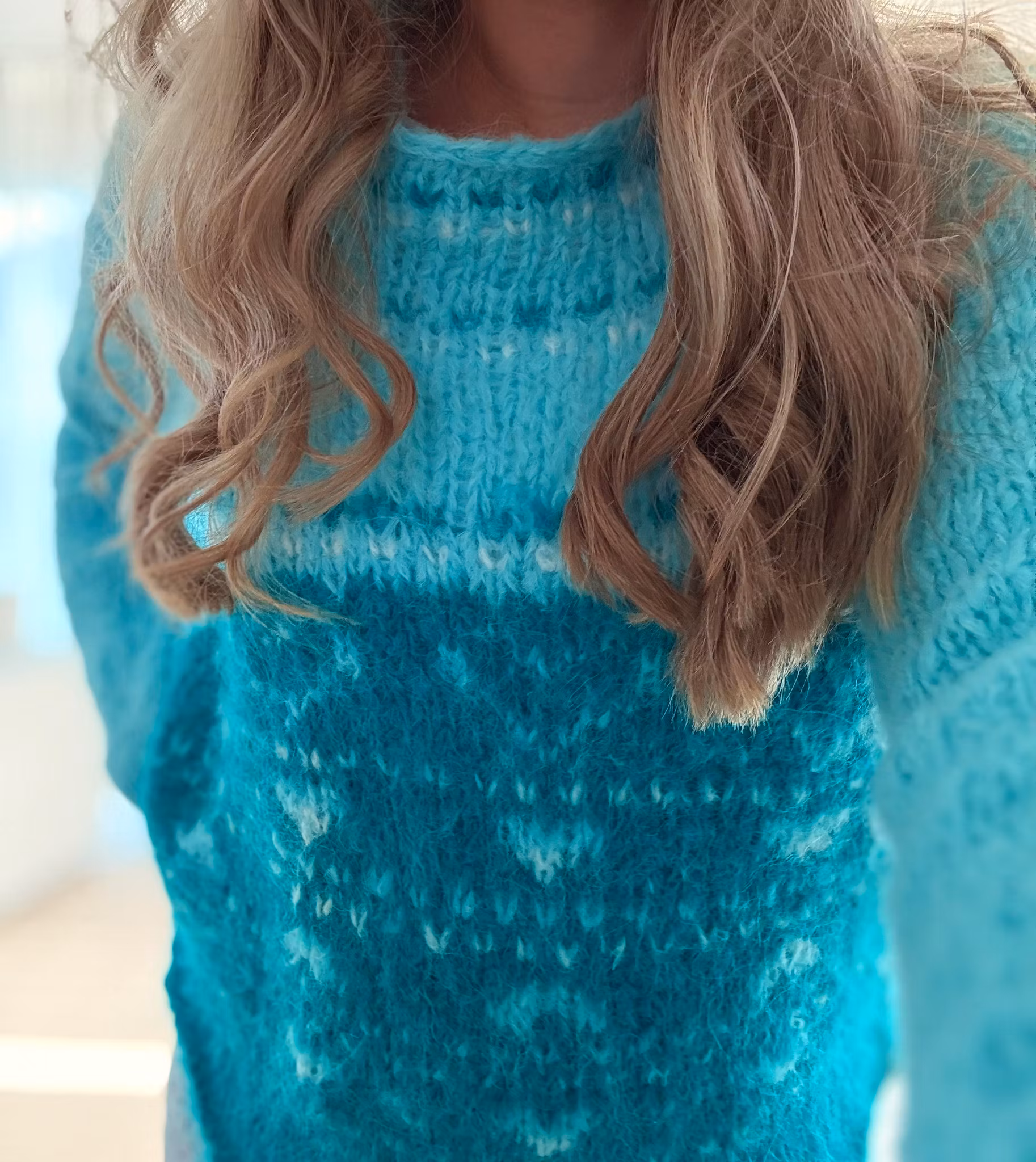 Green Heart er en nydelig, håndstrikket genser med et tydelig budskap: Måtte verden velge kjærlighet. Den strikkes i den luksuriøse garnkvaliteten Fnugg fra House of Yarn, og kombinerer fargene Caribbean Blue, Tropical Blue og White for et harmonisk og hjertevarmt uttrykk. Genseren har et karakteristisk hjertemønster over bolen og to ekstra hjerter ved halskanten for en ekstra detaljrik finish.