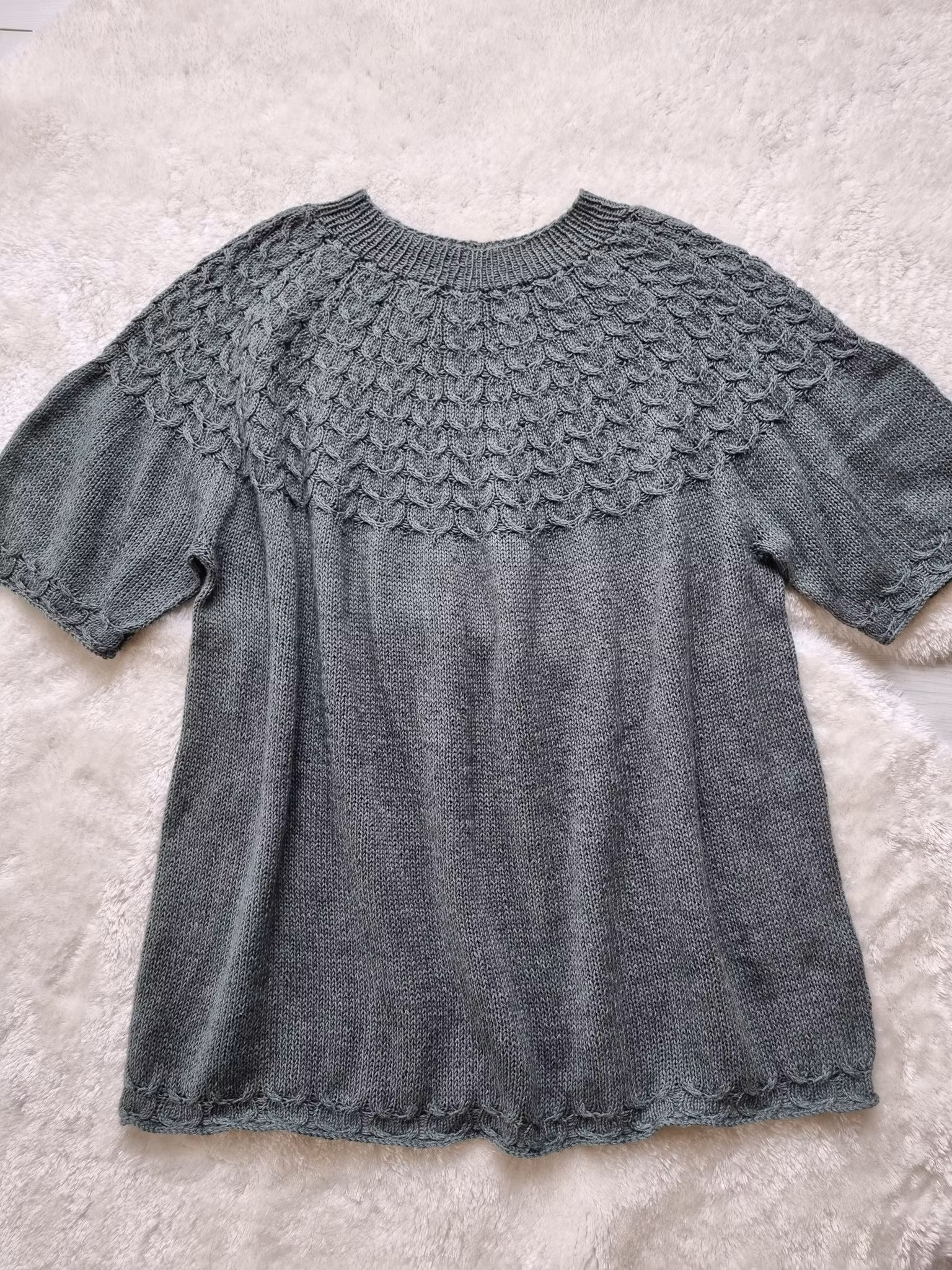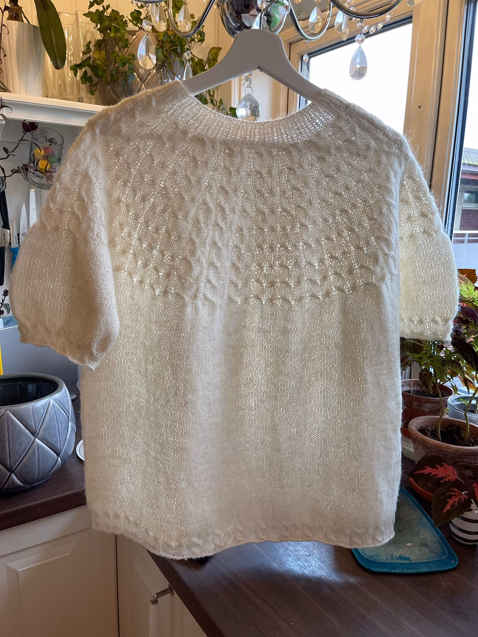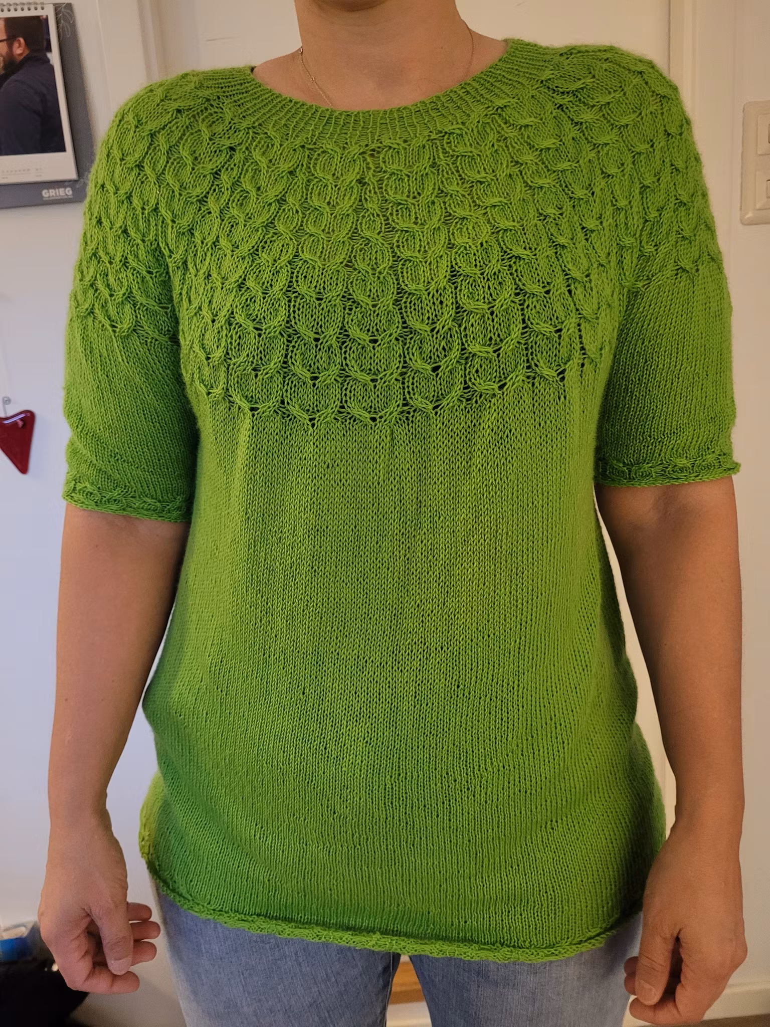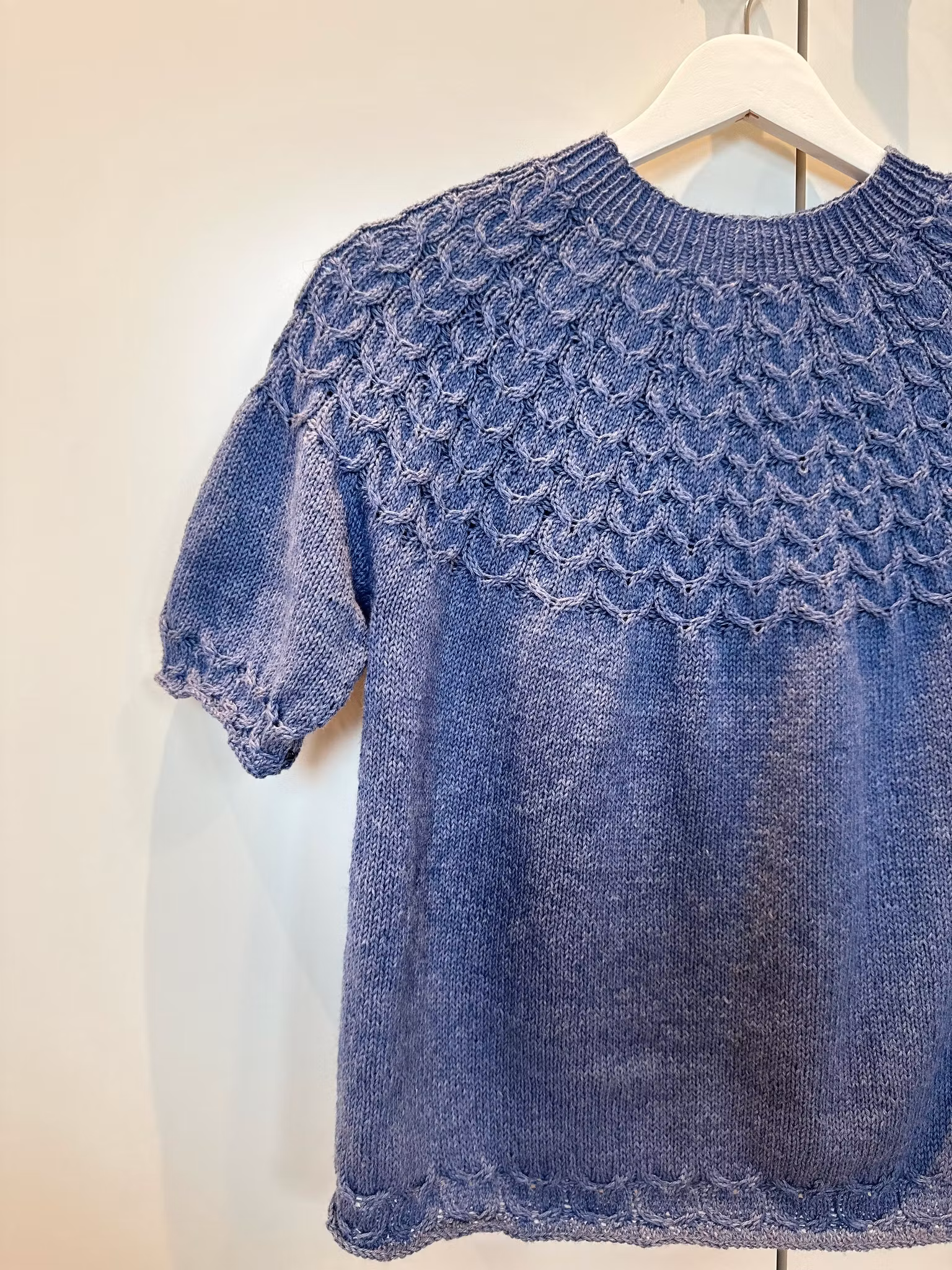 Heartshaped Tee er en lett og søt t-skjorte med delikat strukturmønster på bærestykket som minner om små hjerter. Toppen strikkes ovenfra og ned med økninger som gir en god og flatterende passform. Den har korte ermer og en feminin silhuett som passer perfekt til både hverdags og sommerlige anledninger.