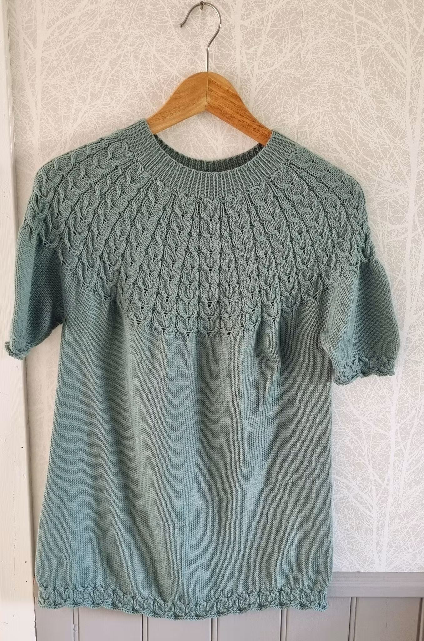 Modellen strikkes i bomull og merino, noe som gir en myk og sval kvalitet. Heartshaped Tee kan enkelt tilpasses ønsket lengde og gir et jevnt og pent resultat med dekorative detaljer på ermer og nederkant.