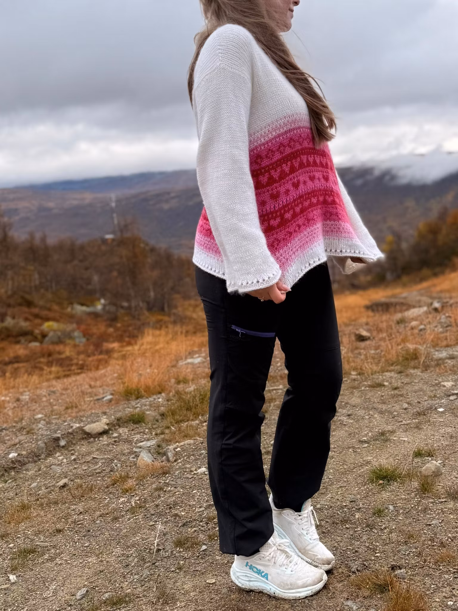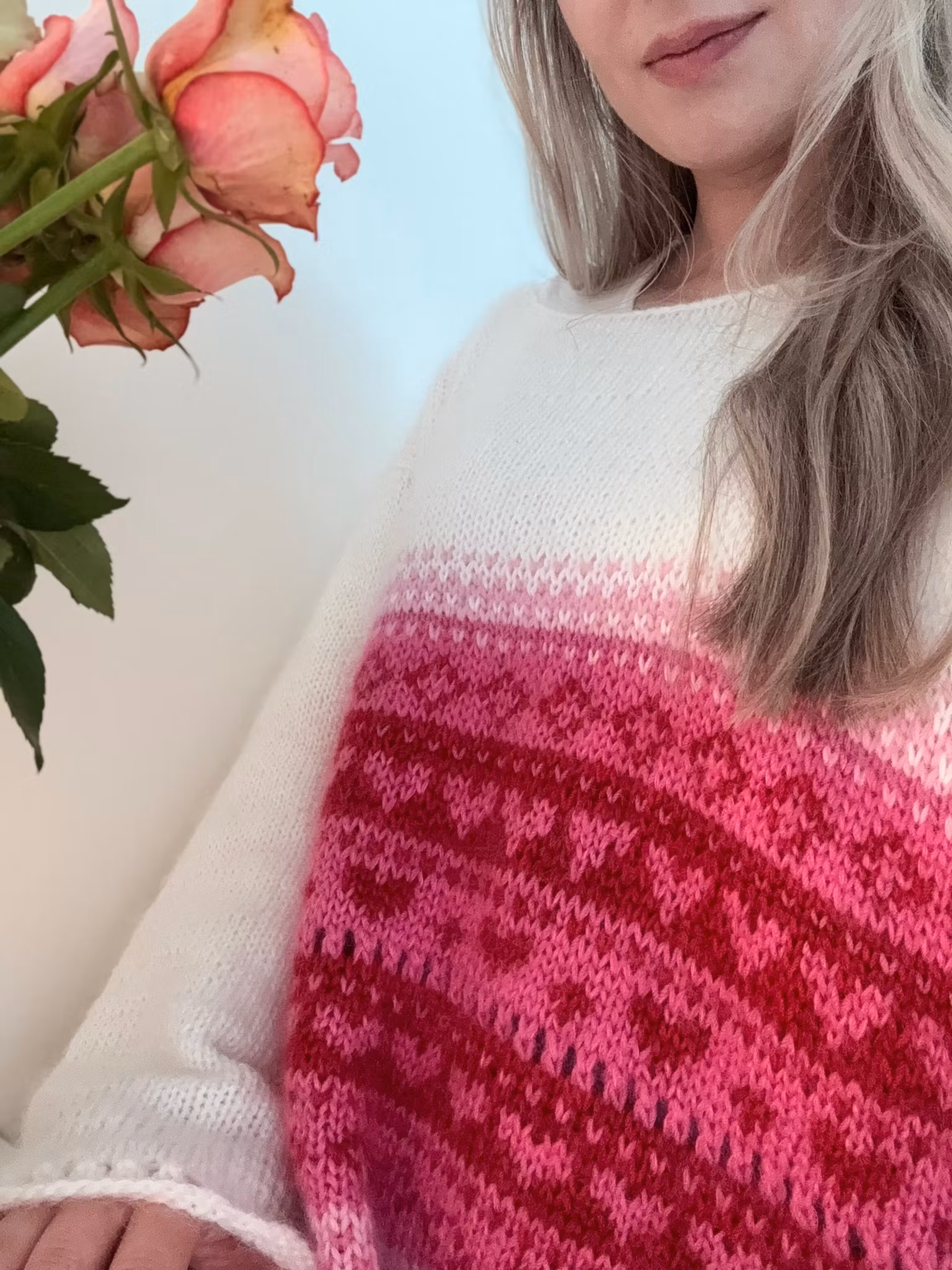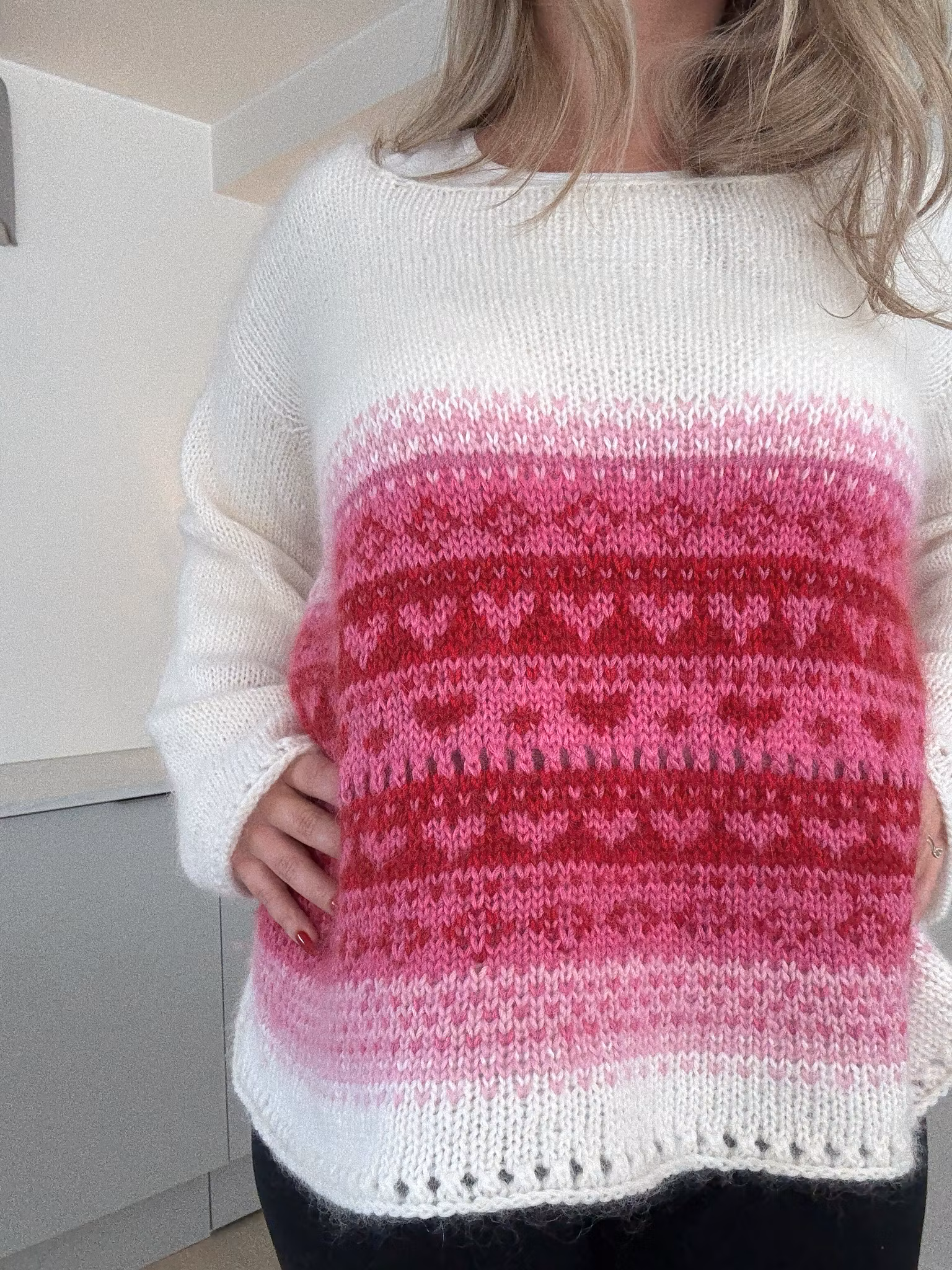 Denne oversized genseren strikkes med dobbel tråd – mohair og babyull – for en lett og luftig følelse. Den har en dekorativ hullrad nederst og et vakkert hjerte-inspirert mønster i tre kontrastfarger. Ingen montering kreves. Ermene strikkes ved å plukke opp masker fra ermehullene og strikkes rundt.