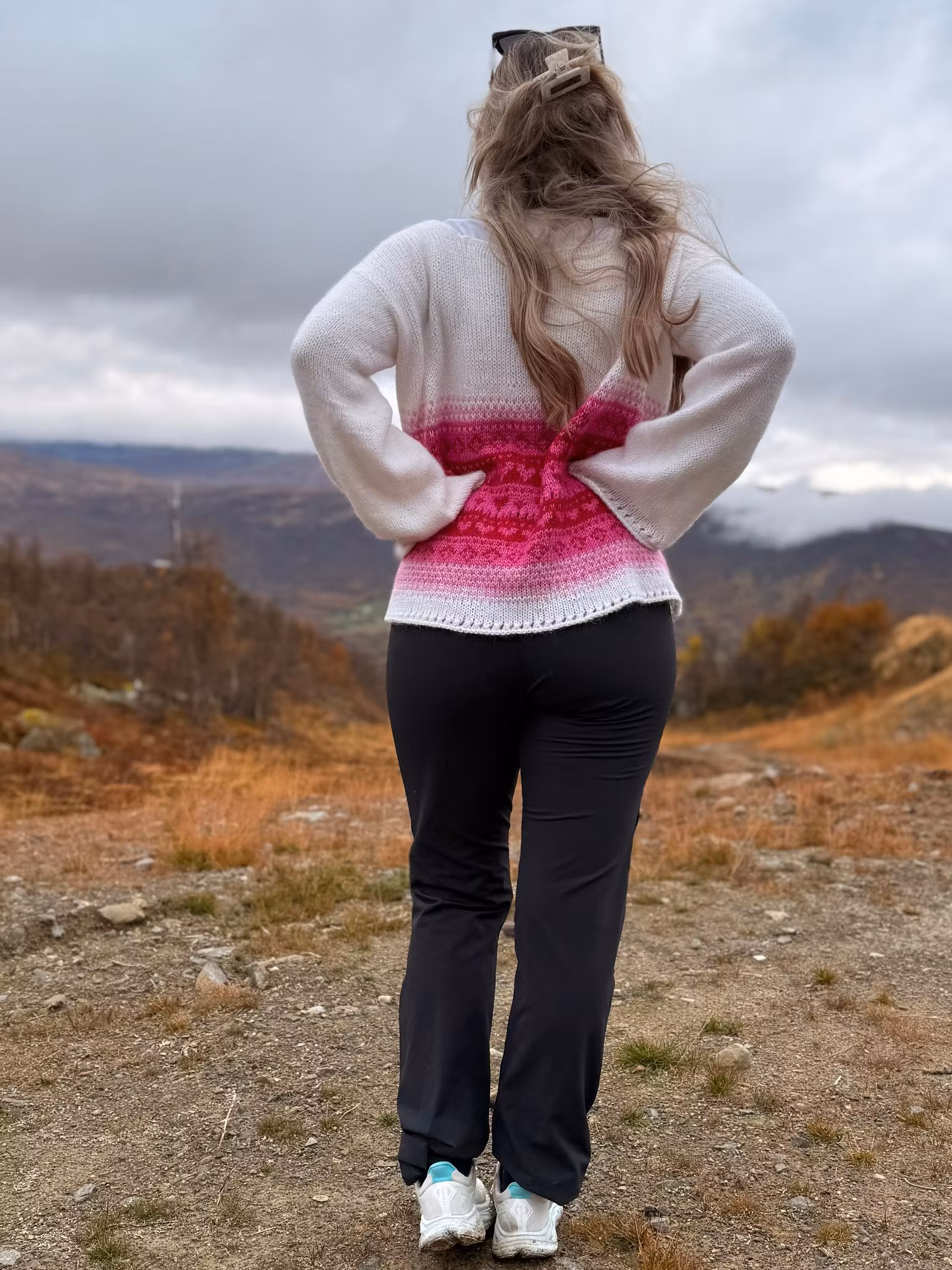 Hjertevarm er en myk og behagelig genser som varmer både kropp og sjel. Den strikkes nedenfra og opp, med planlagte fellinger som skaper en elegant A-form – perfekt for stille stunder hjemme eller ute på tur.