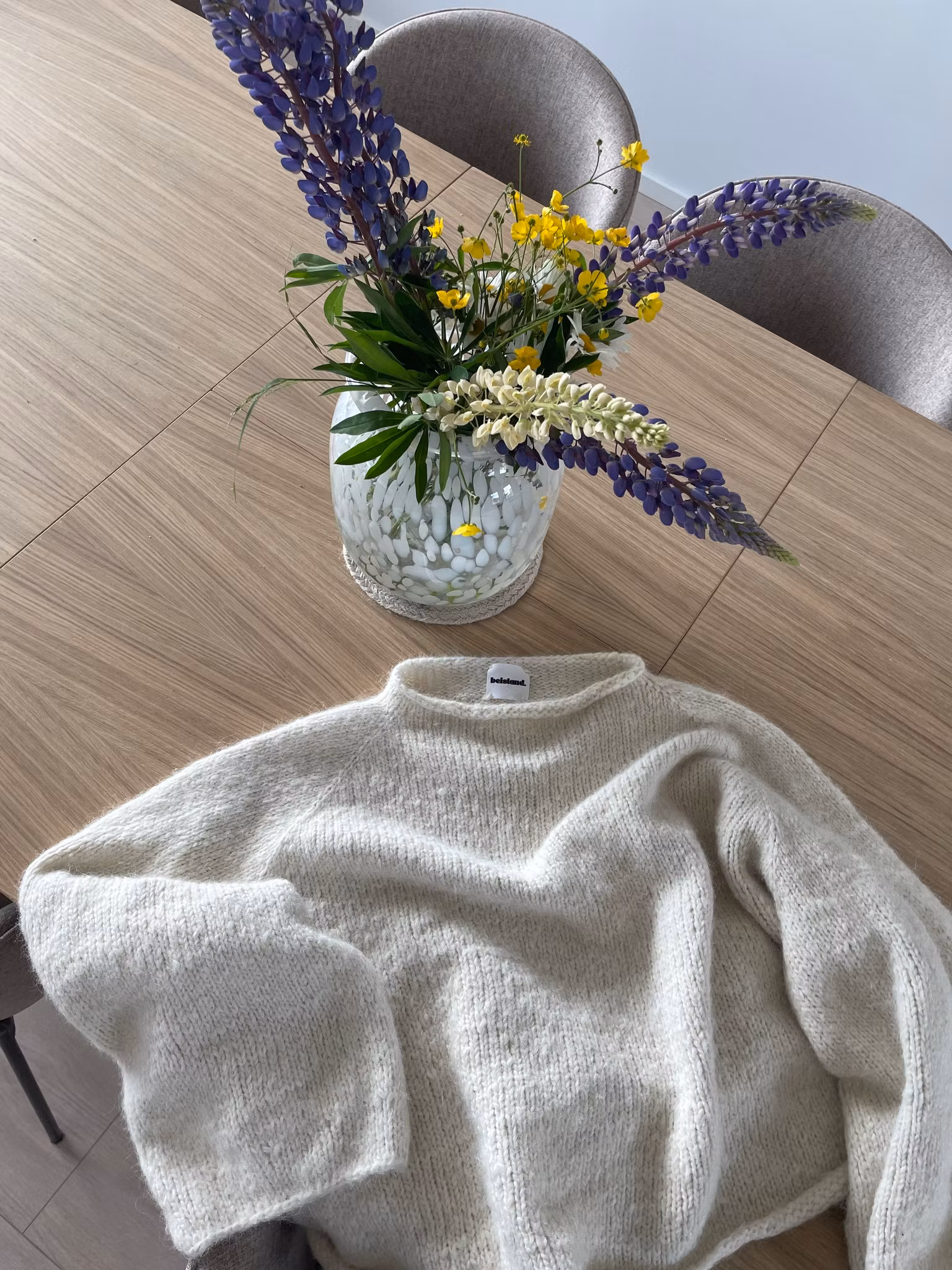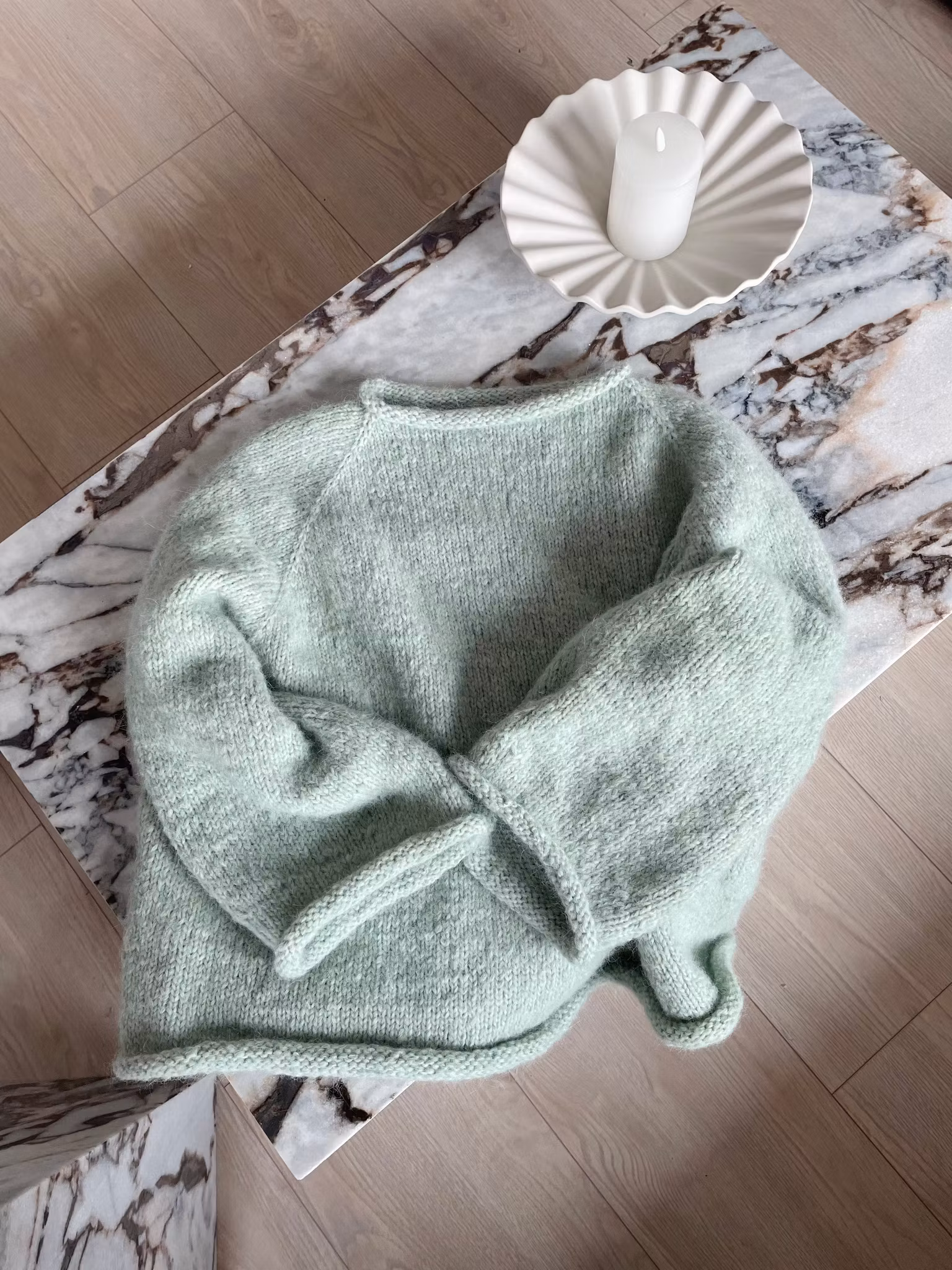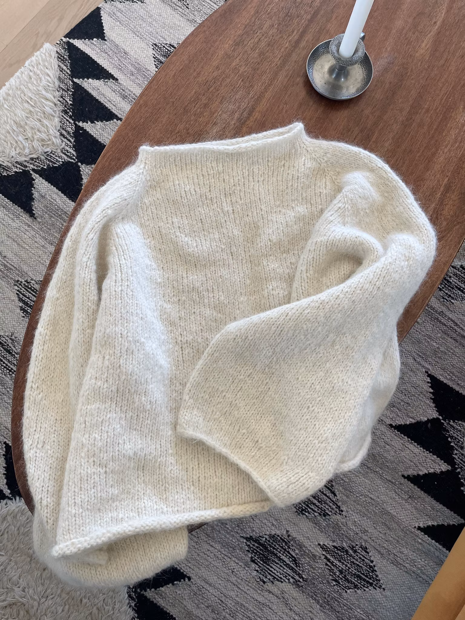 Genseren strikkes ovenfra og ned med raglanøkninger, noe som gir en sømløs konstruksjon og mulighet for justering av lengde. Kombinasjonen av Drops Melody og Drops Air gir en lett, lun og fluffy kvalitet.