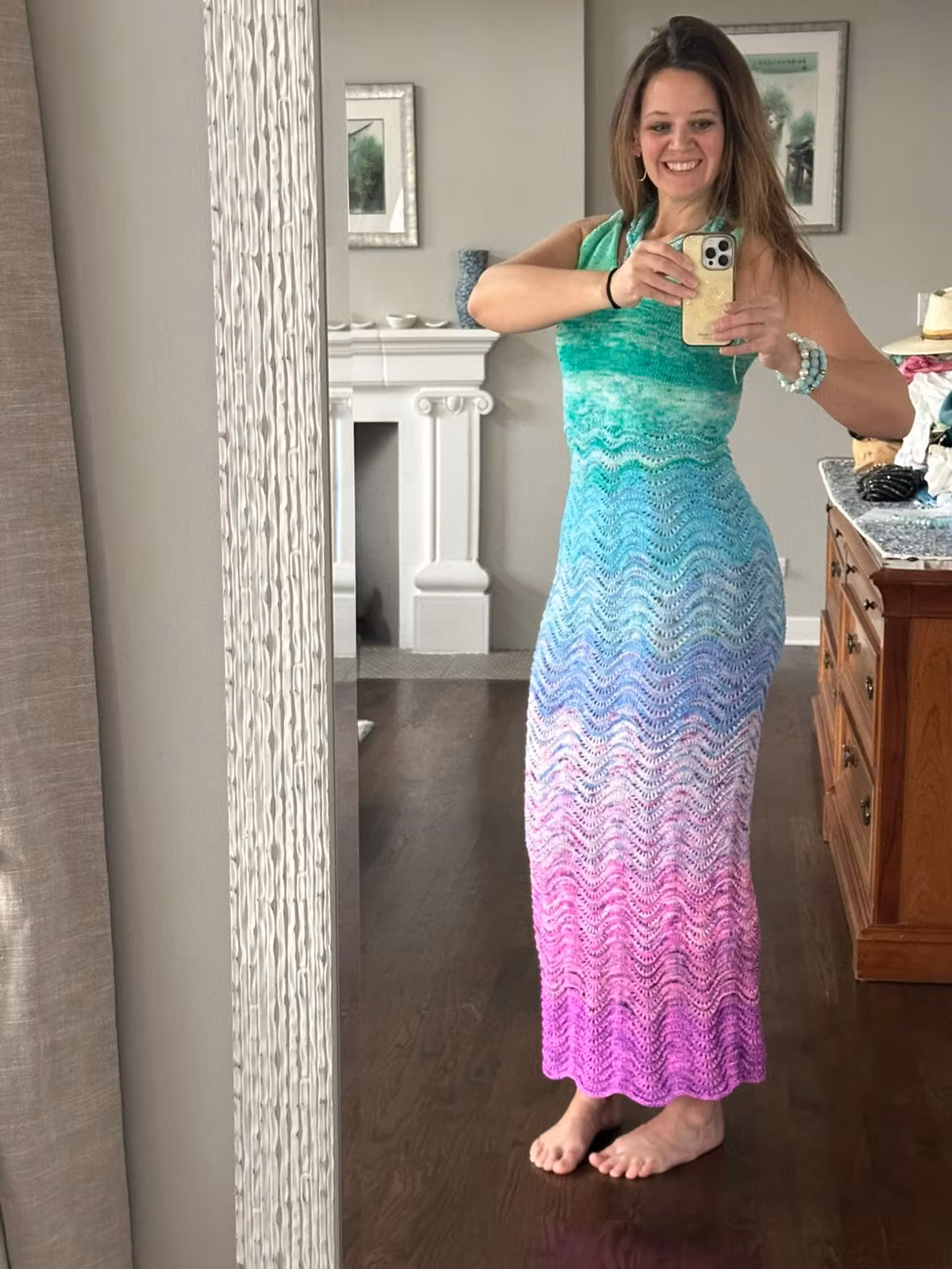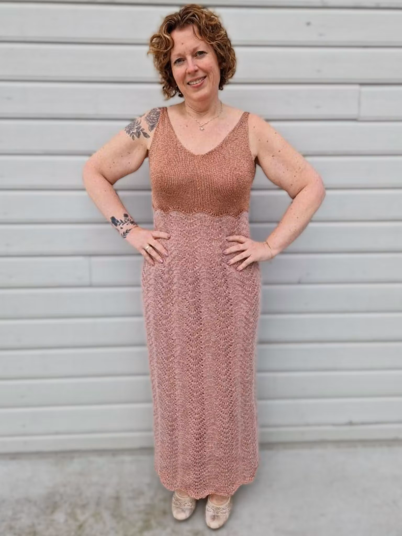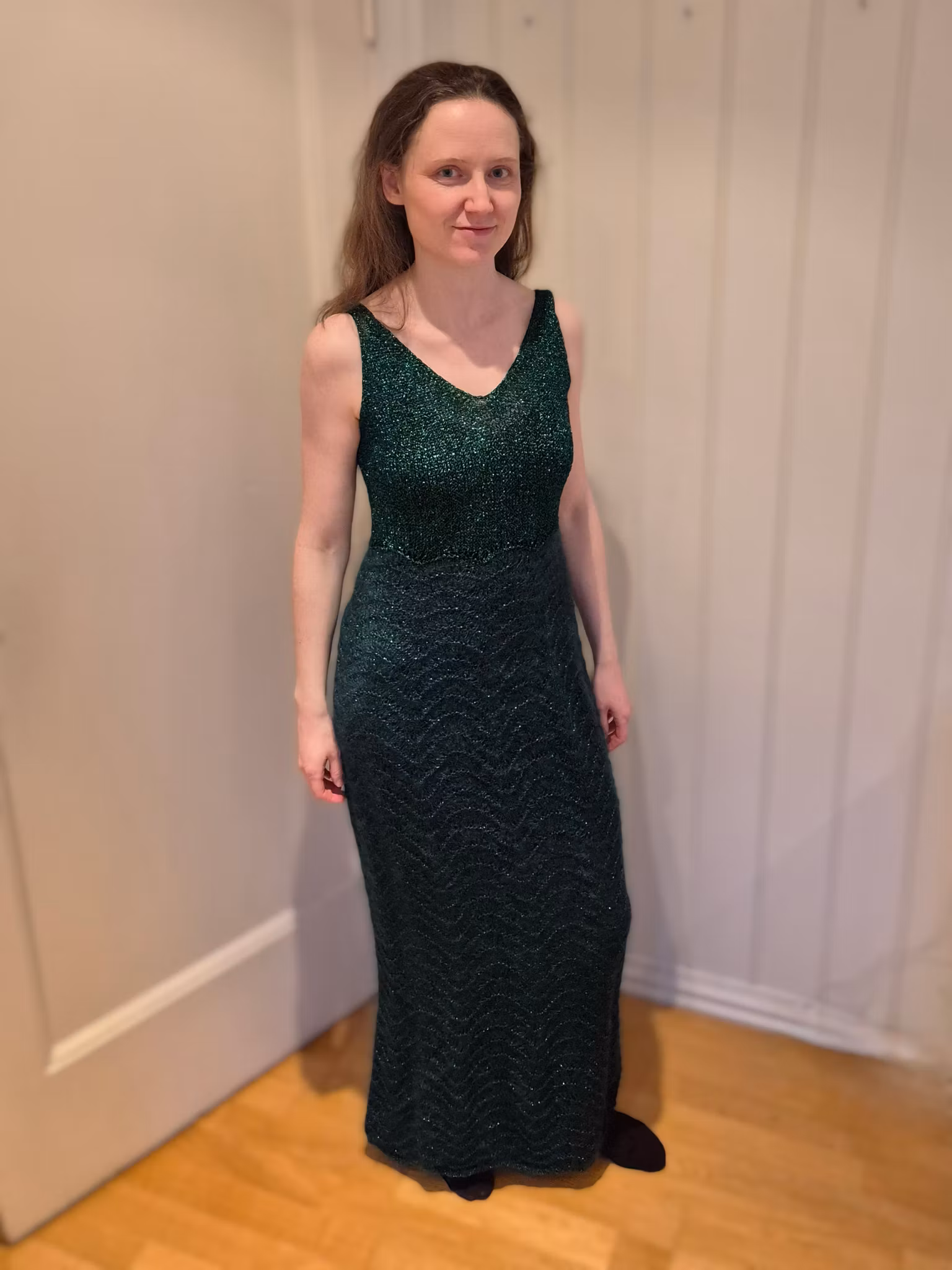 Overdelen strikkes i dobbel tråd glittergarn for et eksklusivt uttrykk, før skjørtet går over i en nydelig kombinasjon av mohair og glitter som skaper liv og struktur i det vakre bølgemønsteret. Resultatet er en kjole som både føles luksuriøs og ser imponerende ut – perfekt til både hverdag og fest.