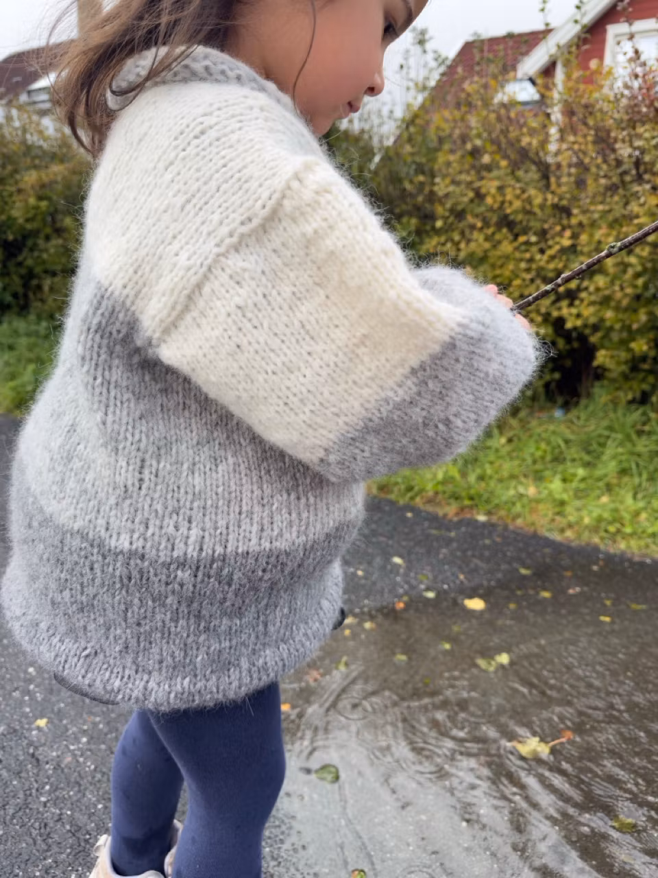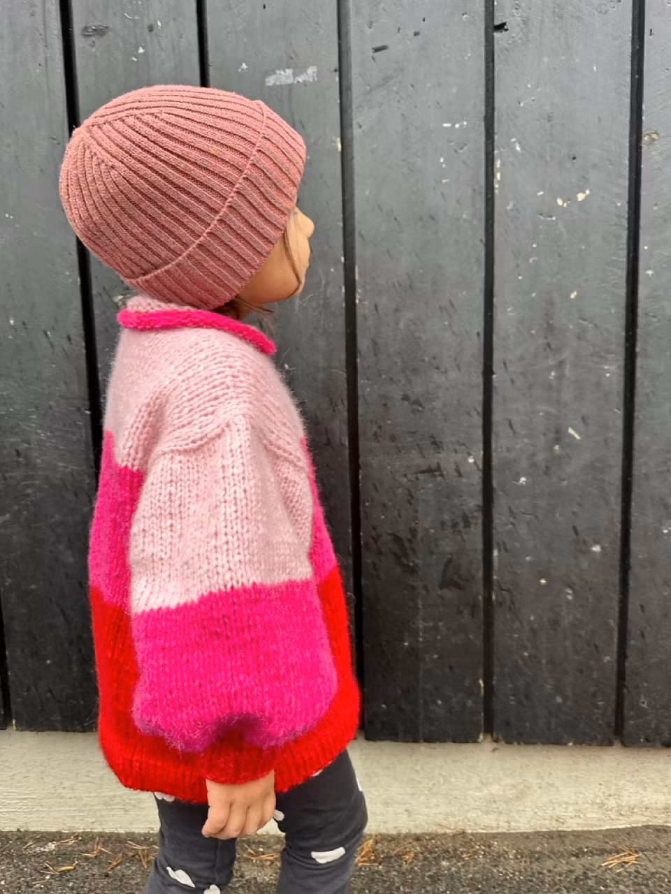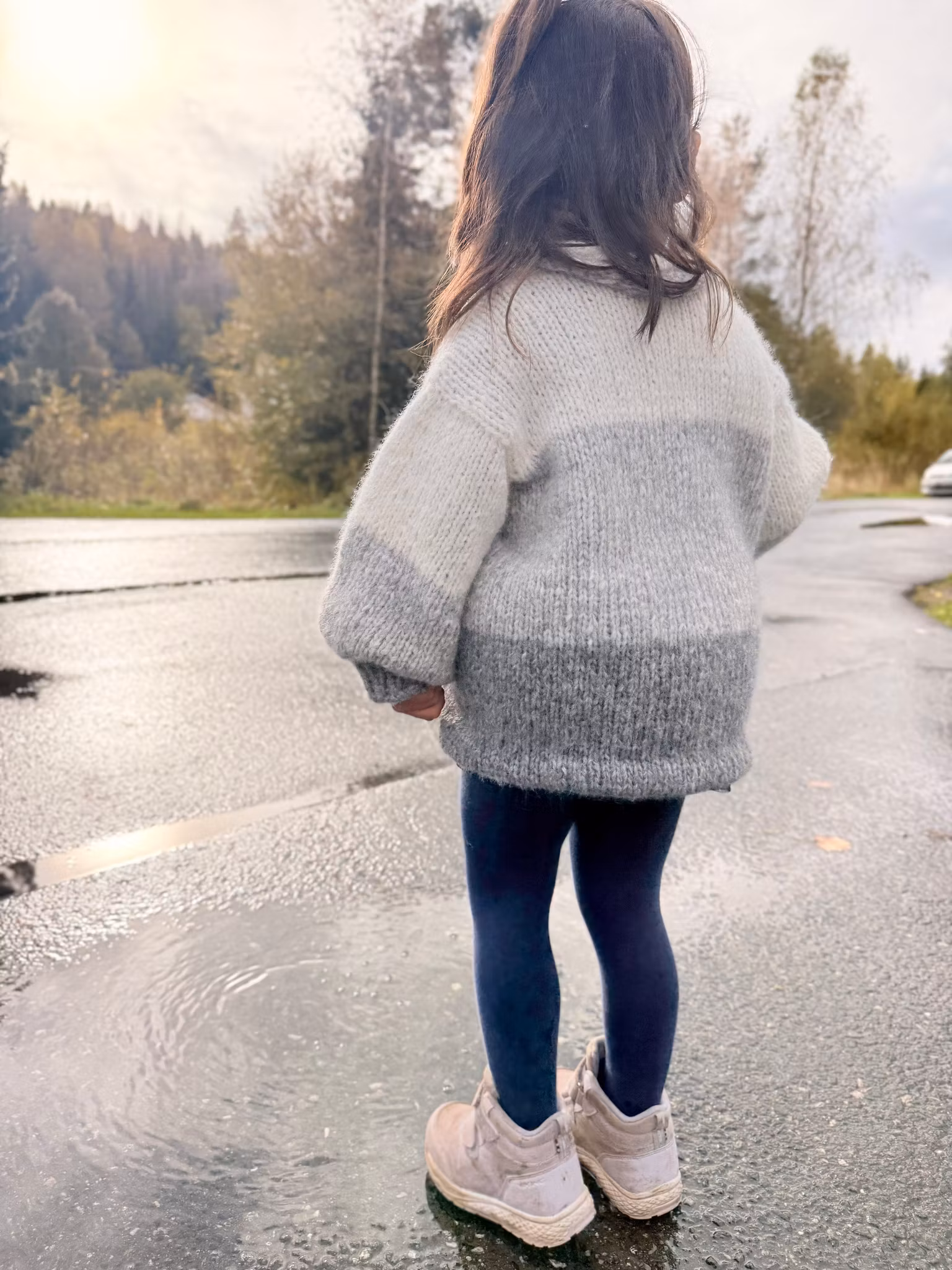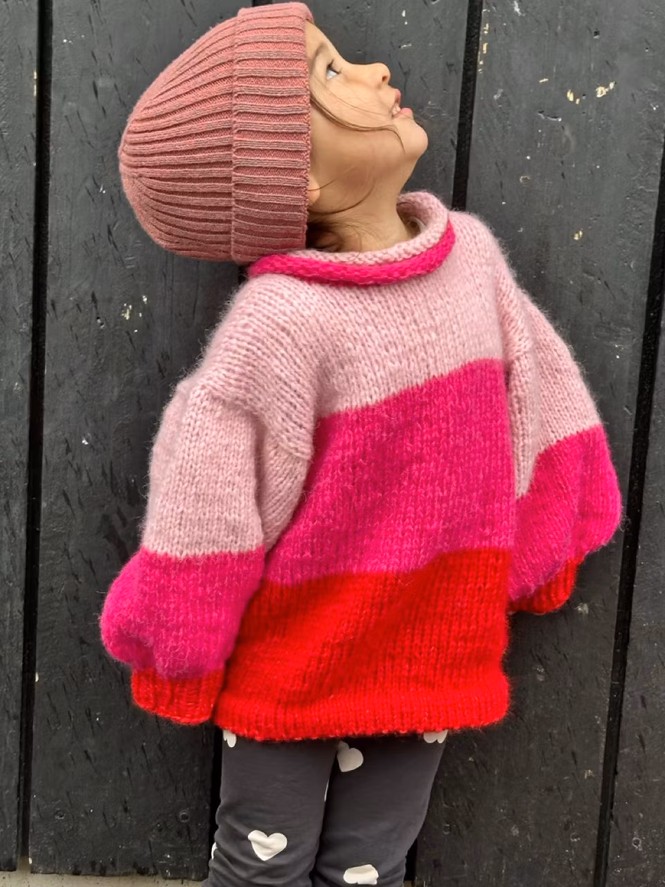 Signes genser er en varm og deilig barnegenser strikket i mykt Puno-garn fra Rauma. Den strikkes nedenfra og opp i tre farger, og finnes i to varianter: én i gråtoner og én i friske rød- og rosanyanser. Genseren har en løs og komfortabel passform, og du kan velge mellom to ulike ermebredder.