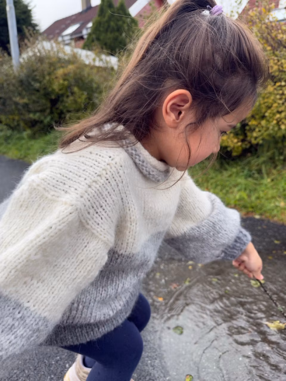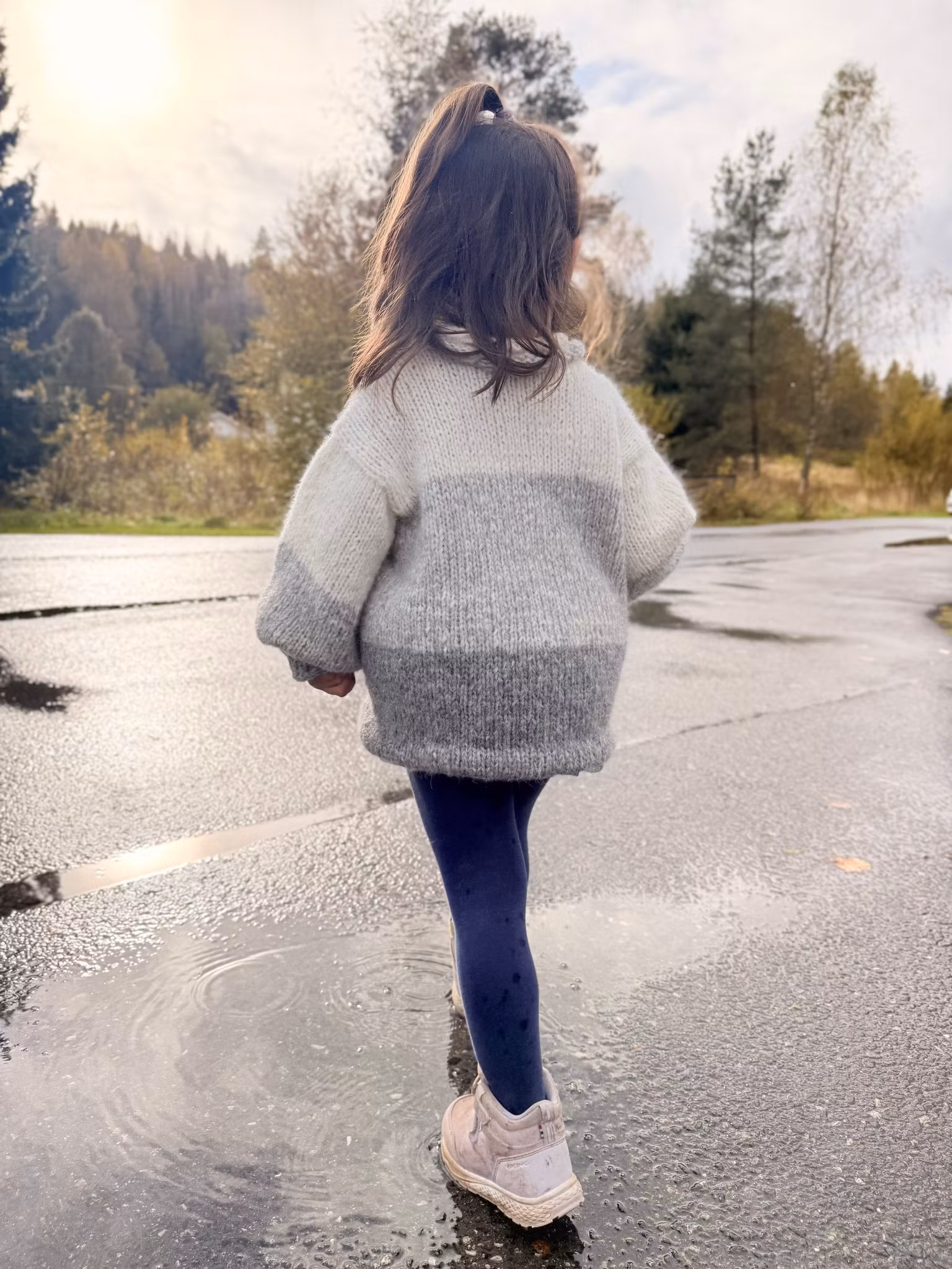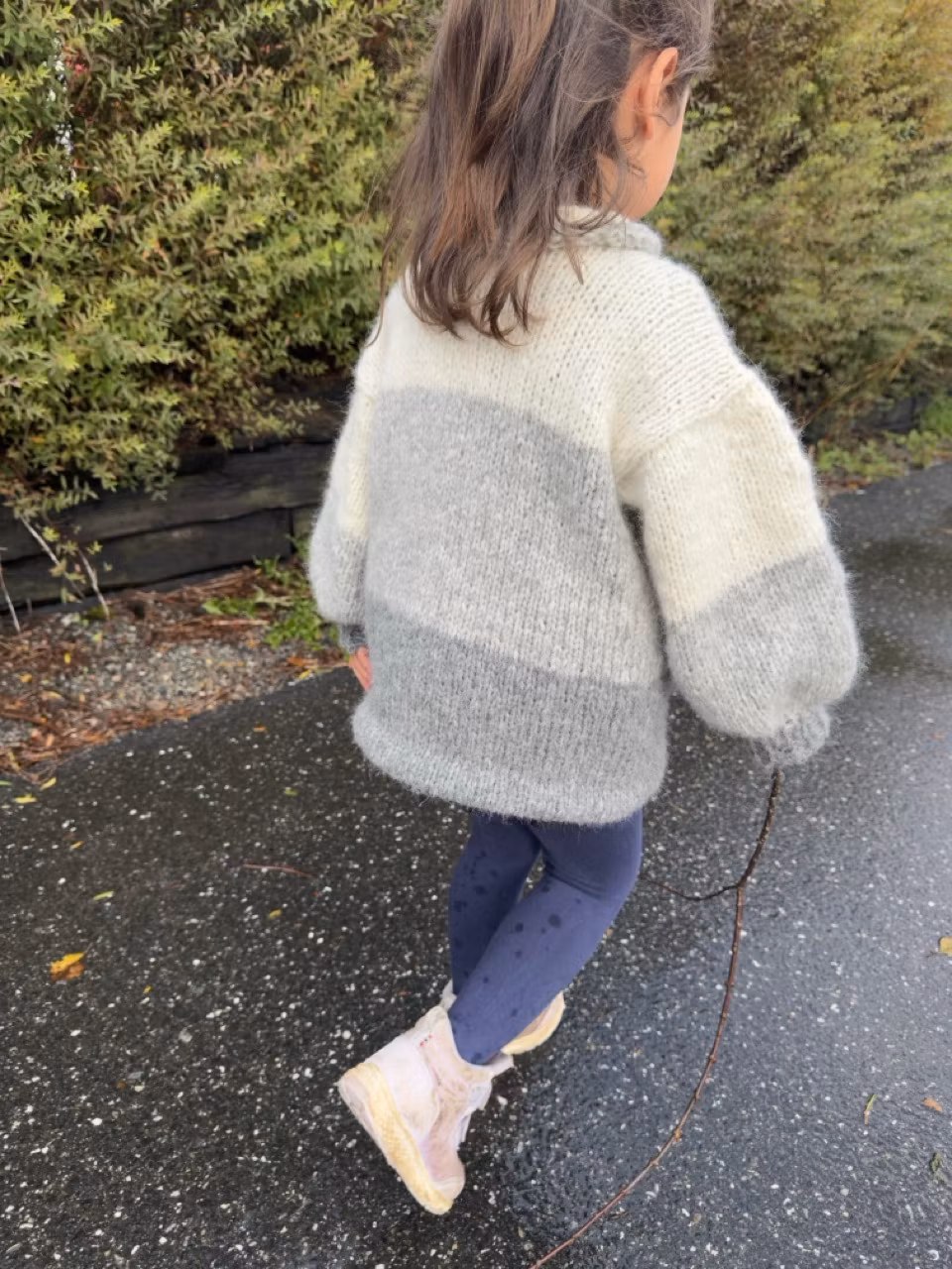 Signes genser er en varm og deilig barnegenser strikket i mykt Puno-garn fra Rauma. Den strikkes nedenfra og opp i tre farger, og finnes i to varianter: én i gråtoner og én i friske rød- og rosanyanser. Genseren har en løs og komfortabel passform, og du kan velge mellom to ulike ermebredder.