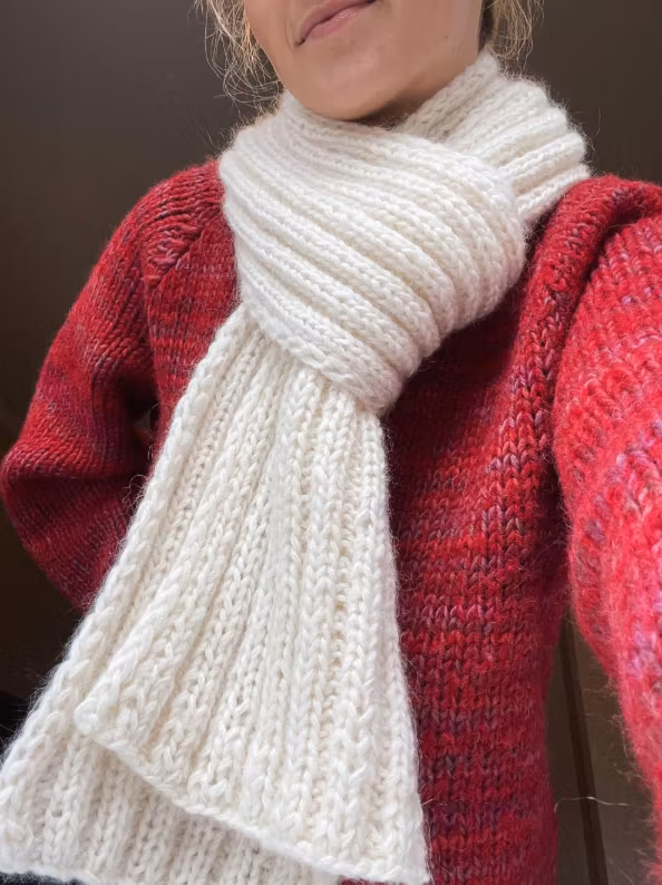 Oppskriften inneholder forklaring for både liten og stor størrelse, slik at du kan velge mellom et smalt og langt skjerf eller en bredere og mer markert variant. Etter blokking åpner ribbestrukturen seg og gir skjerfet et mykere og mer elastisk uttrykk.