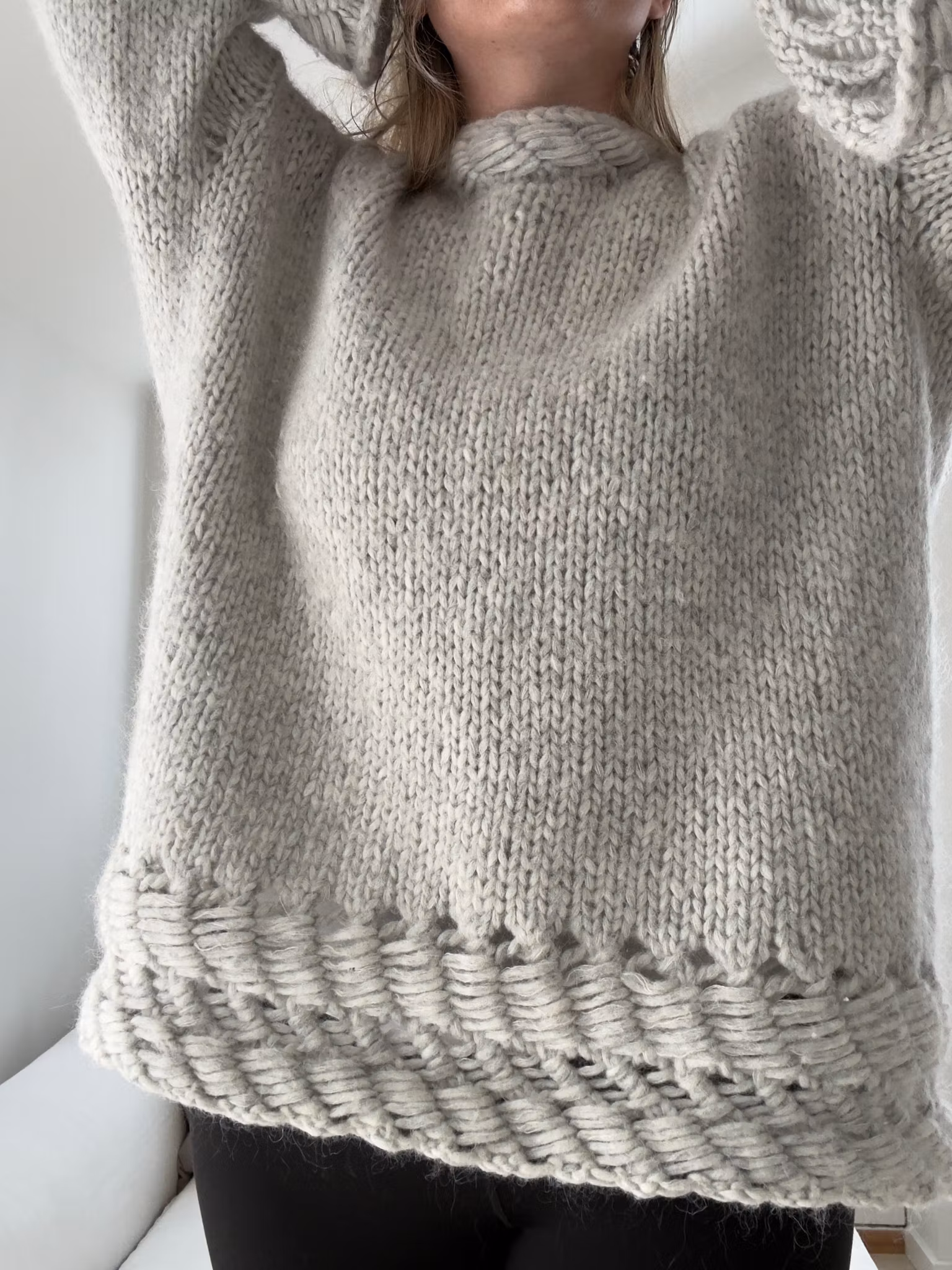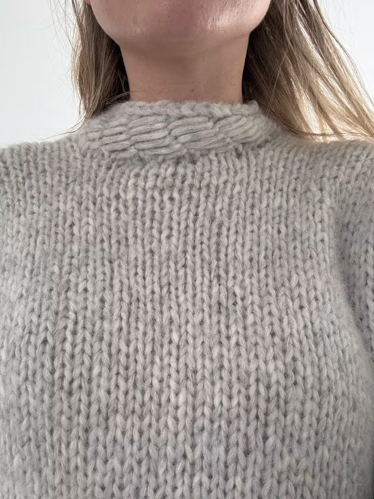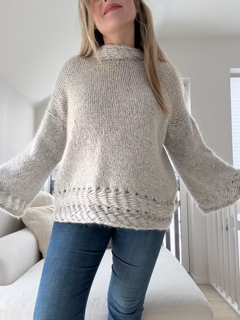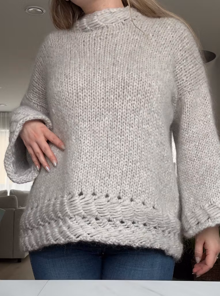 Konstruksjon: Strikkes nedenfra og opp på rundpinne, deles til for- og bakstykke ved ermehull