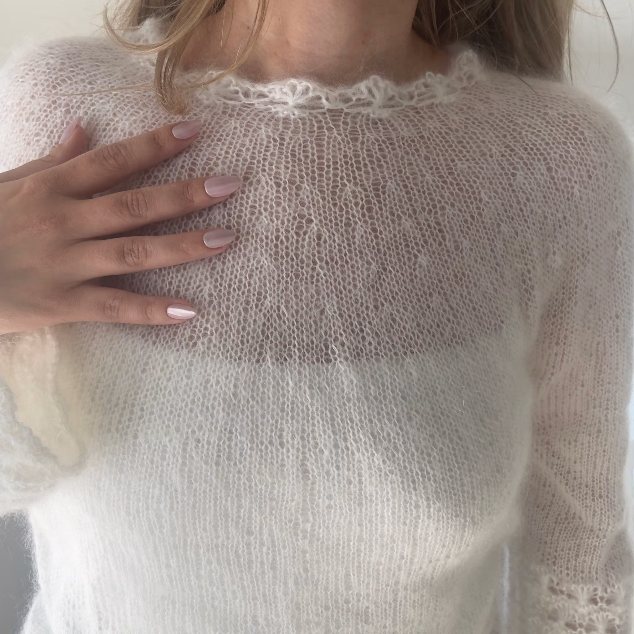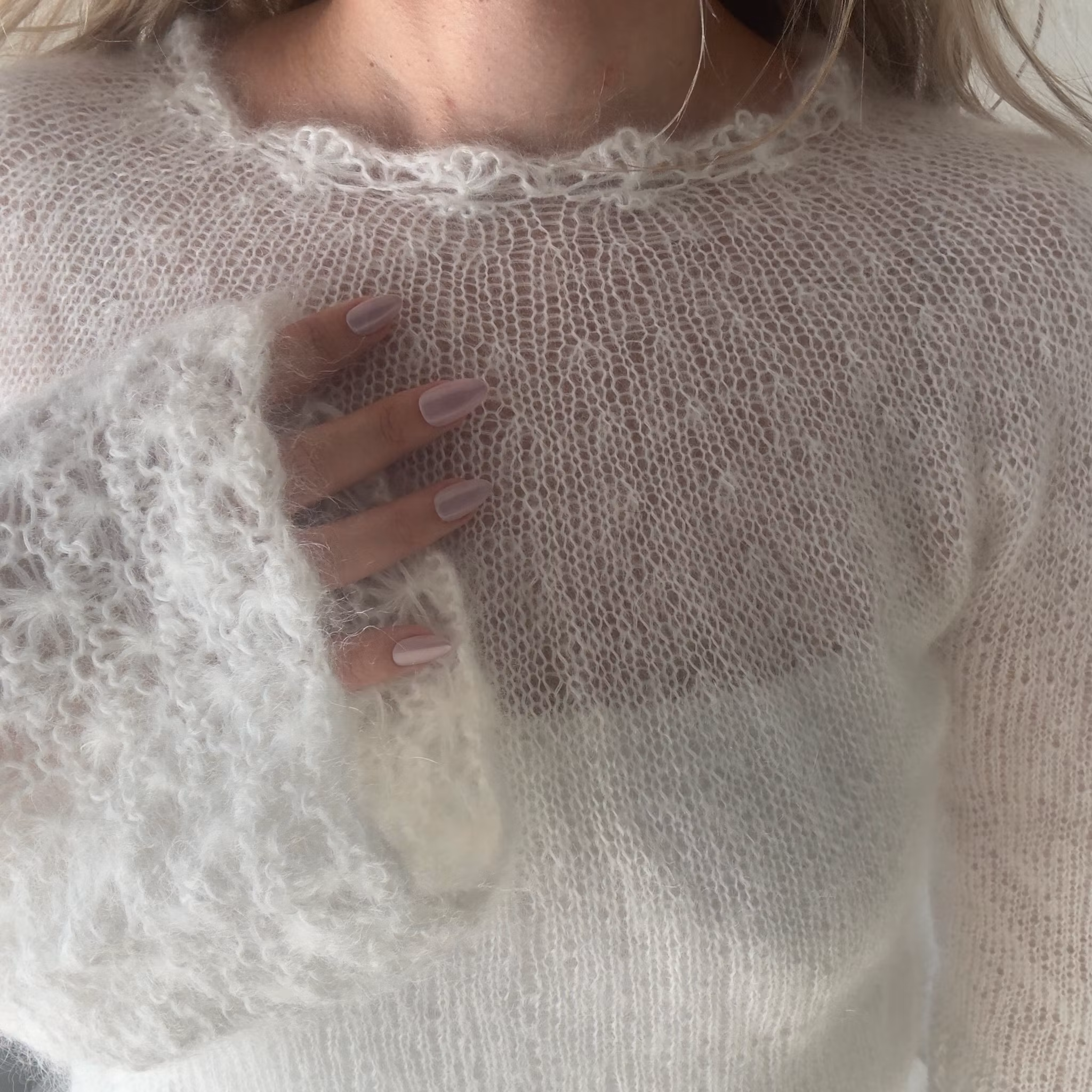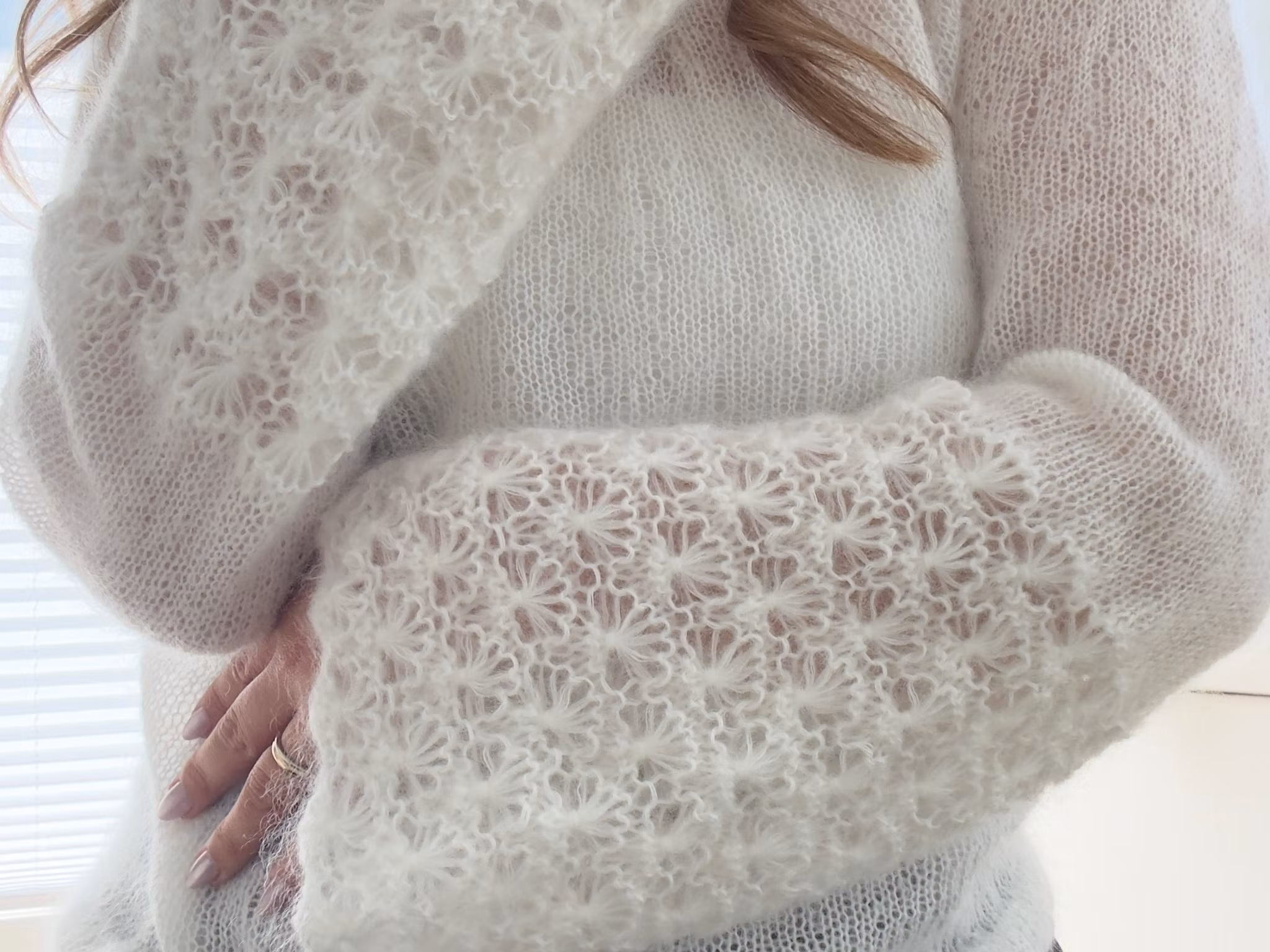 Snow flowers er en lett og luftig genser med norsk preg og dekorative blomsterborder på ermene. Strikket i mohair for et fluffy resultat!