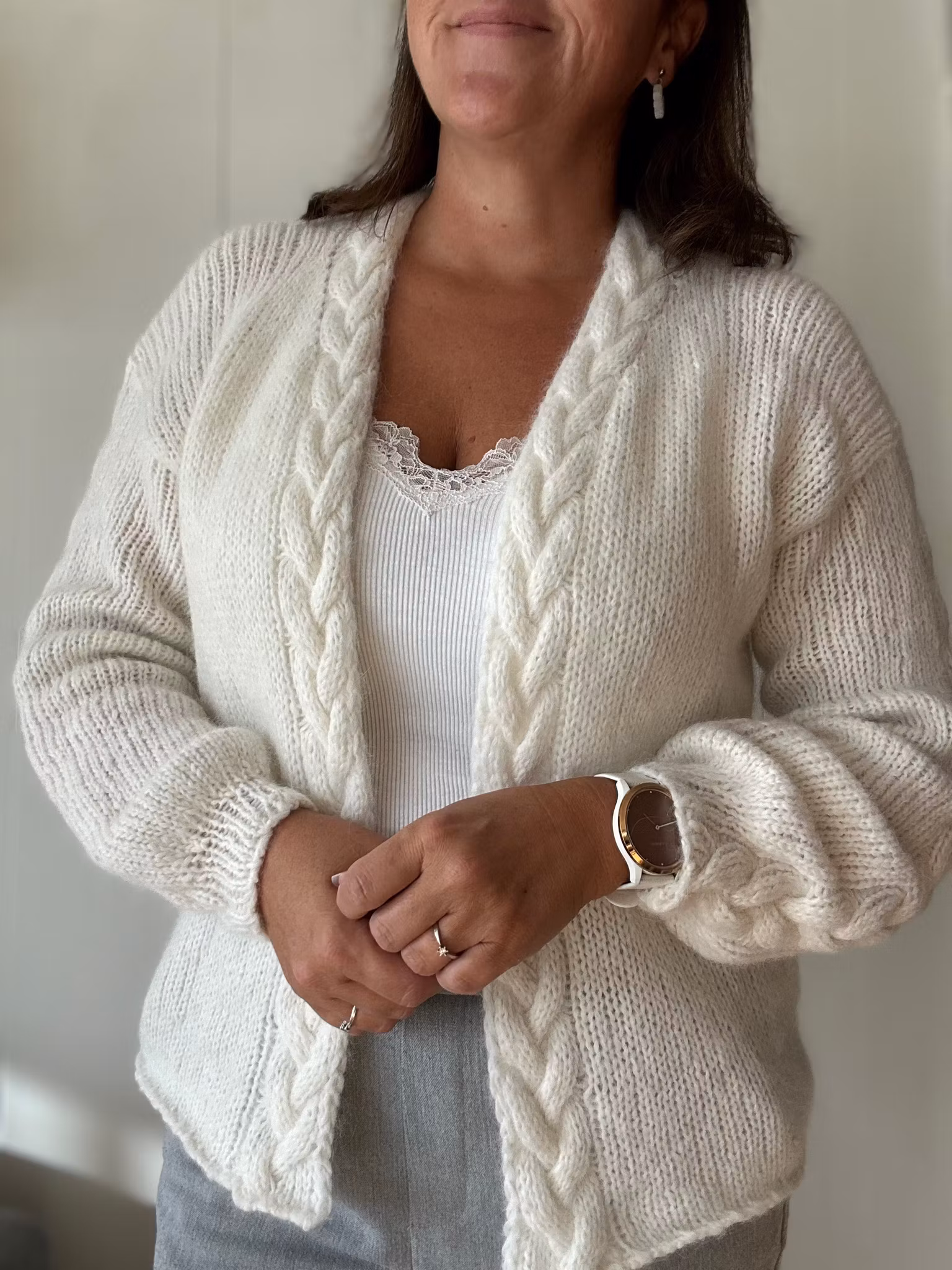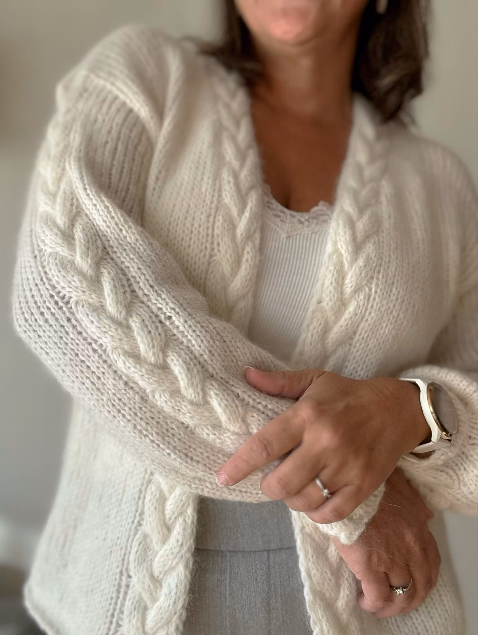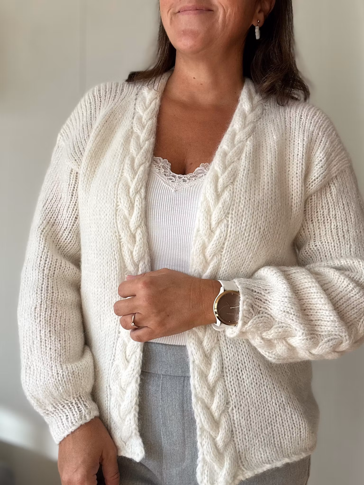 Snuggles Cable Cardigan fra Abbaknit Design er en myk, oversized cardigan med dekorative flettemønstre som gir et luksuriøst uttrykk. Den strikkes ovenfra og ned, med flott kabelstruktur langs ermene og forstykkene. Perfekt for deg som elsker komfort kombinert med stil!
