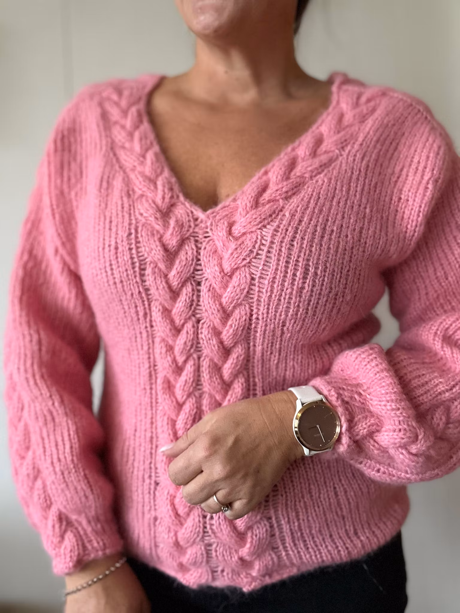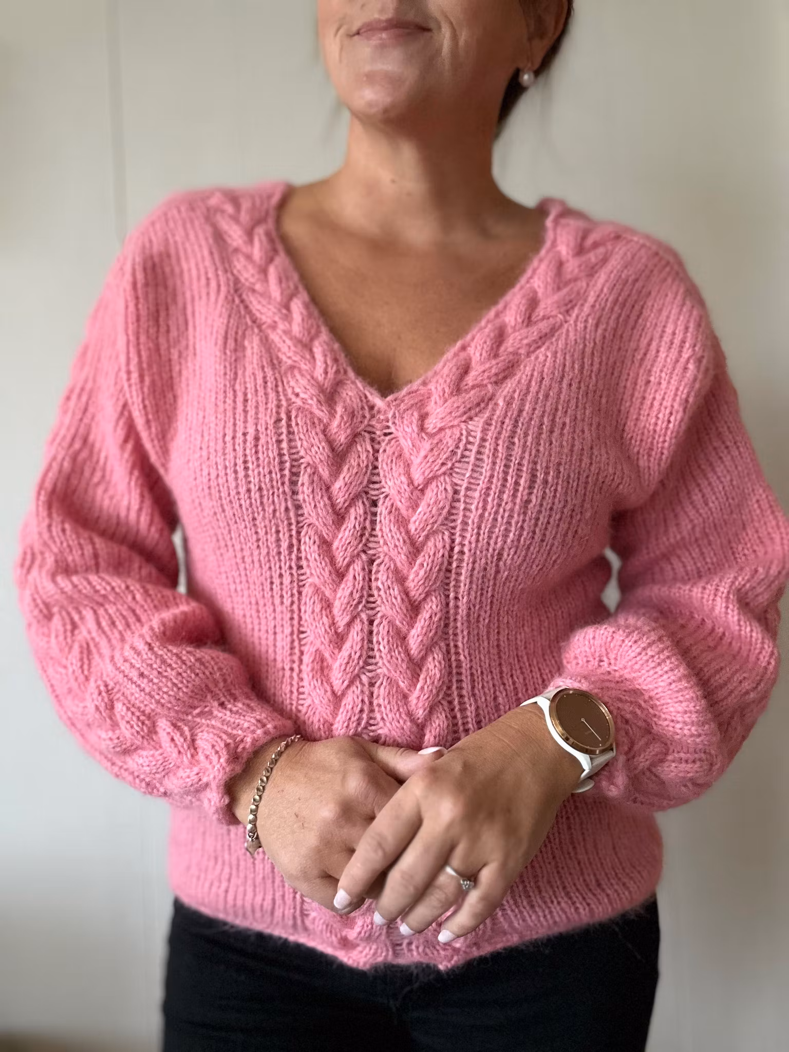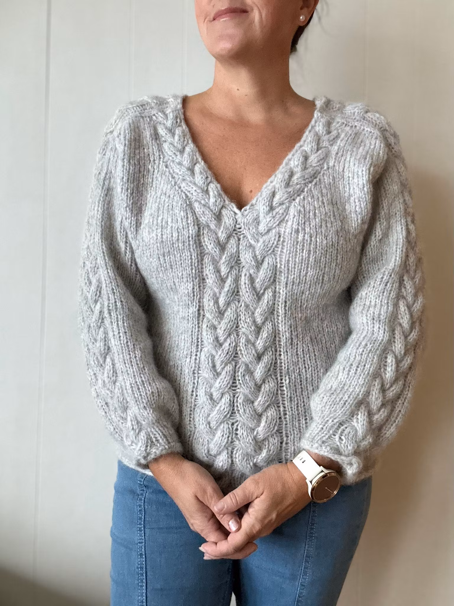 Genseren strikkes ovenfra og ned med vakkert flettemønster i front, skuldre og ermer. Du former plagget med økninger og plukker opp masker etter hvert – noe som gir en sømløs og pen finish.