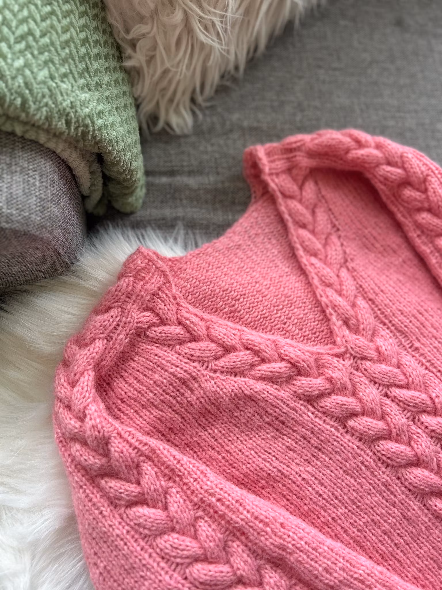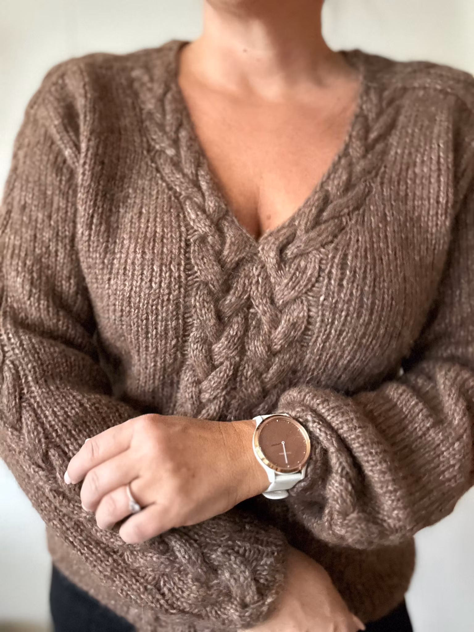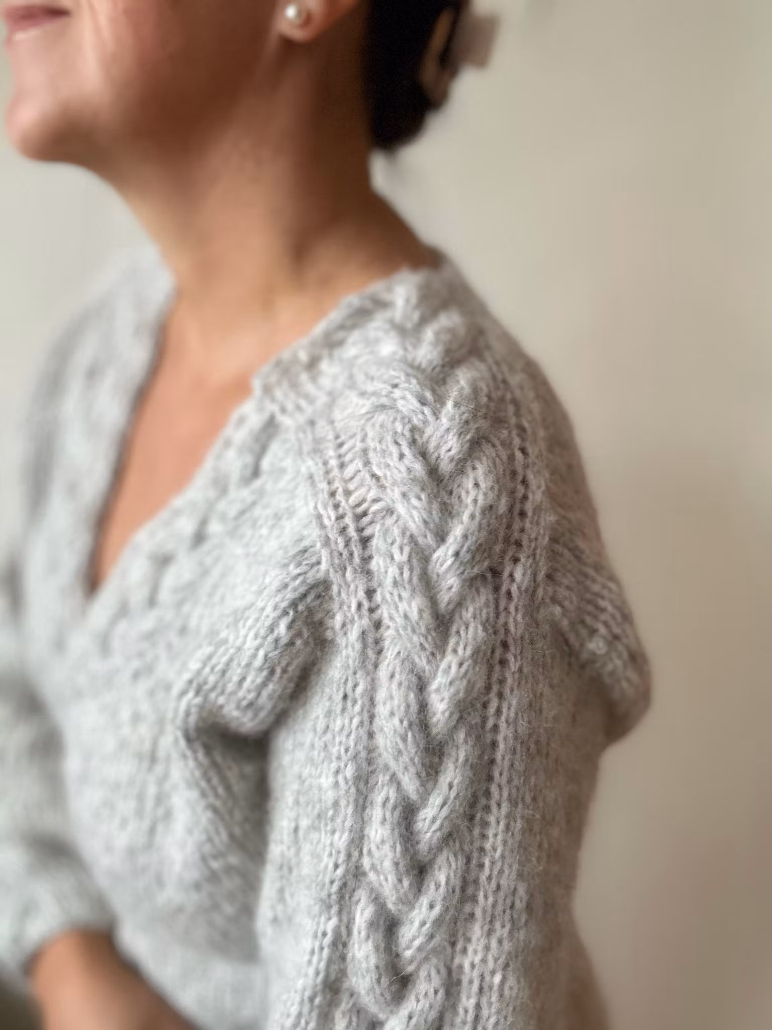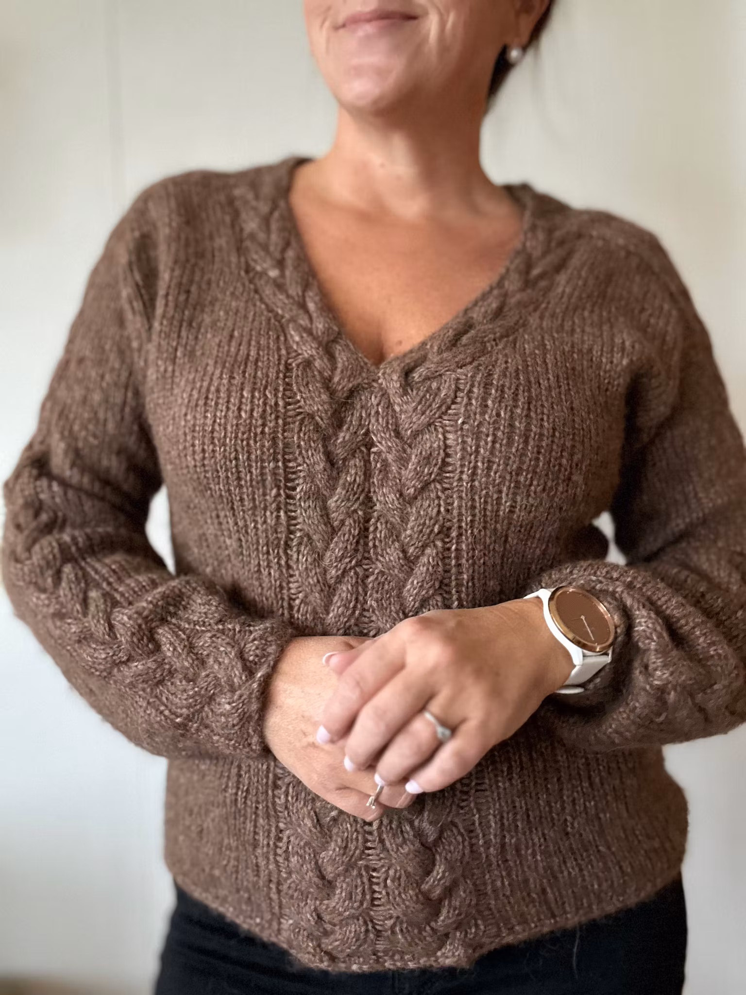 Genseren strikkes ovenfra og ned med vakkert flettemønster i front, skuldre og ermer. Du former plagget med økninger og plukker opp masker etter hvert – noe som gir en sømløs og pen finish.