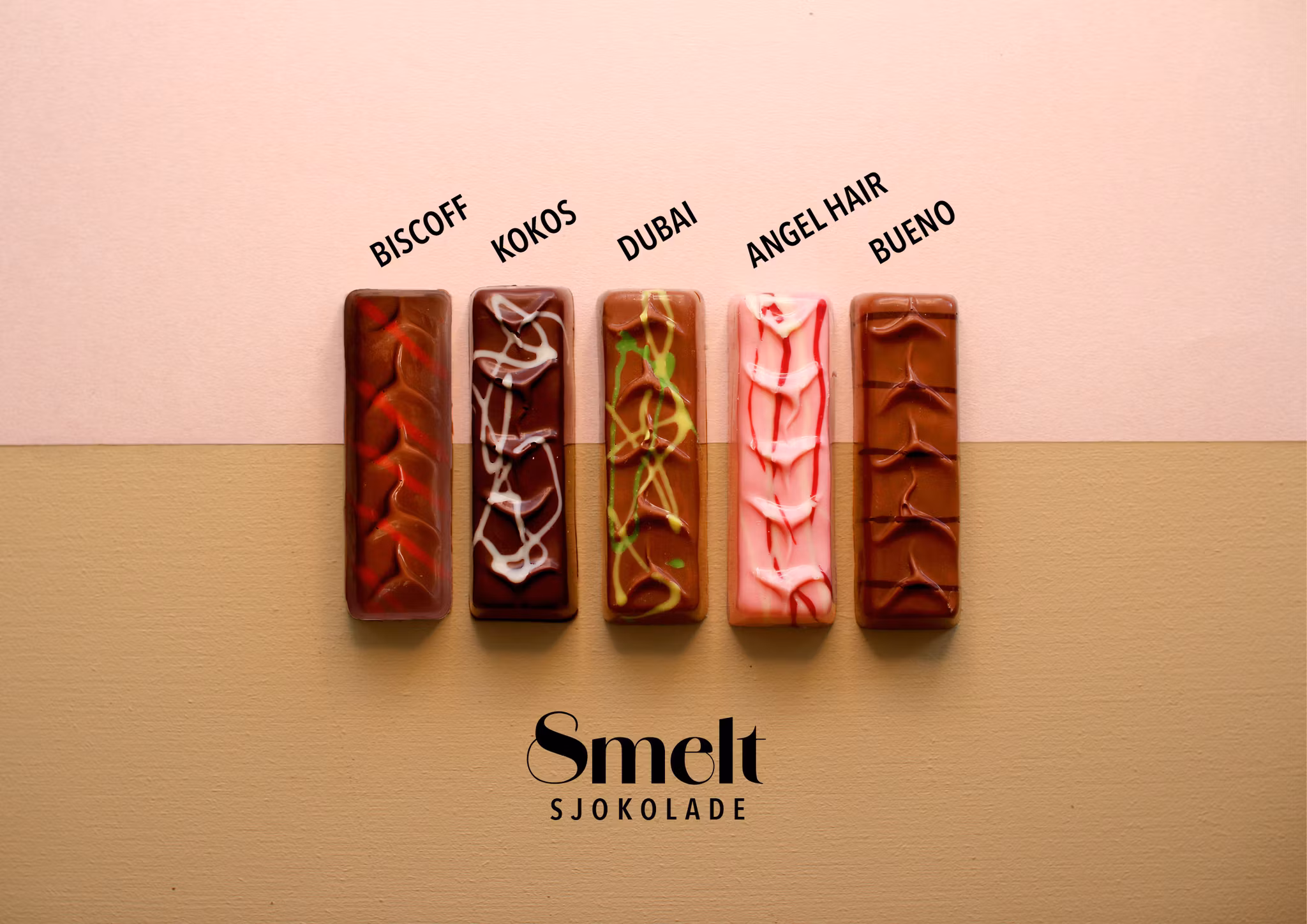 Taste Box samler fem av Marsipan Compagniets mest populære håndlagde sjokoladebarer i praktisk 35 g-størrelse. Hver bar byr på sin egen reise gjennom tekstur, fylde og aroma – fra eksotisk pistasjkrem og sprø katayfi i Dubai Bar, til myk hasselnøttkrem i Bueno, tropisk sødme i Kokos Gianduja, og delikate nyheter som Angel Hair og Bueno Kinder.