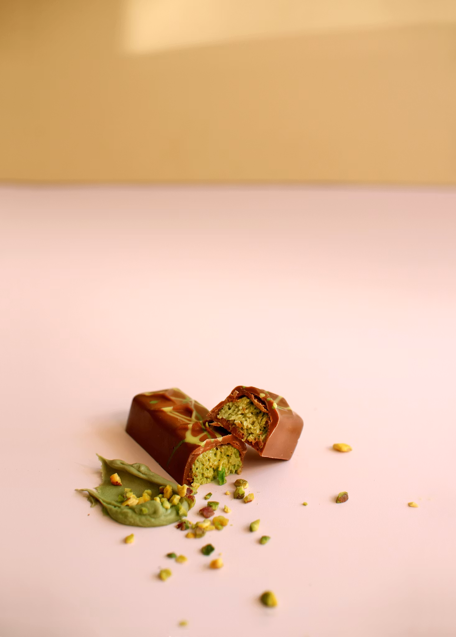 Dubai Bar: Håndlaget sjokolade med rik pistasjkrem-praliné og sprø katayfi-strimler, innkapslet i sveitsisk melkesjokolade.